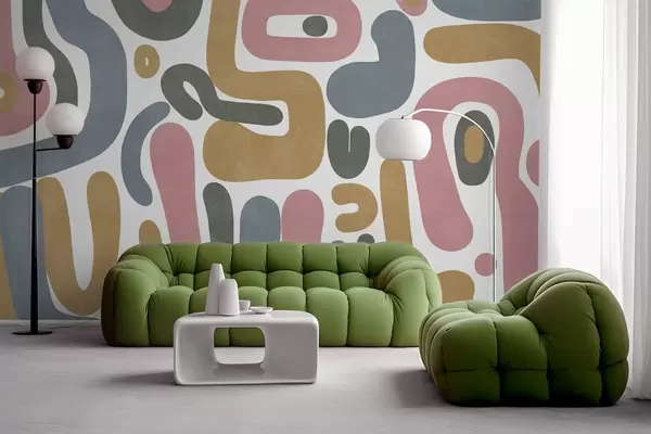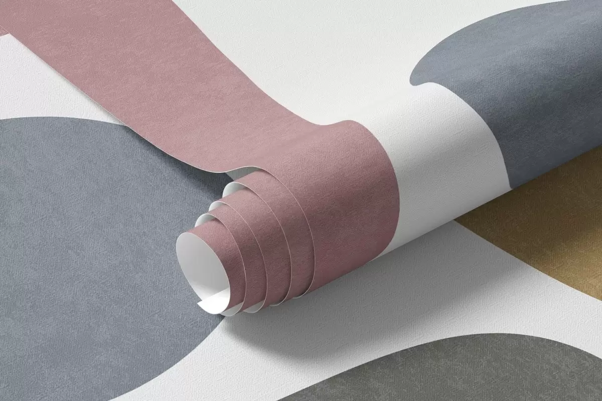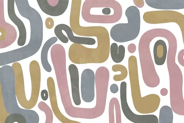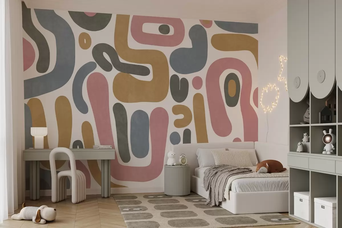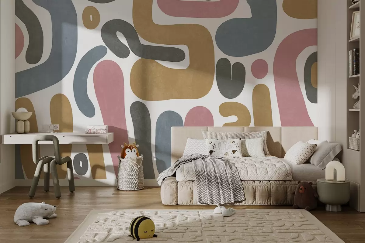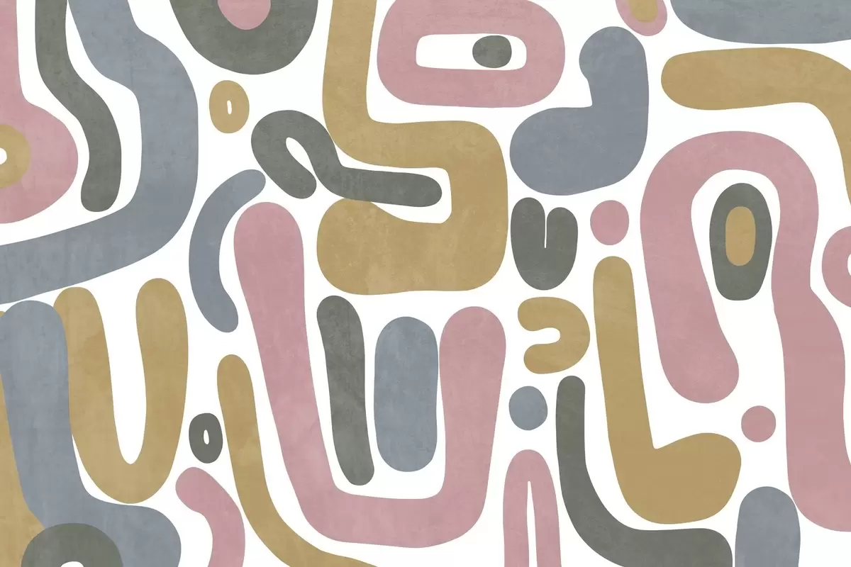 Wall murals Abstract textured shapes in pastel pink, muted blue, mustard yellow and grey on a white background modern art Nr. w09620