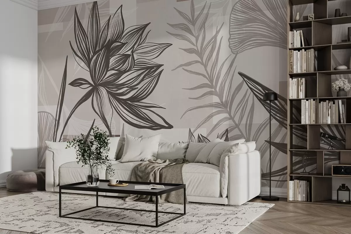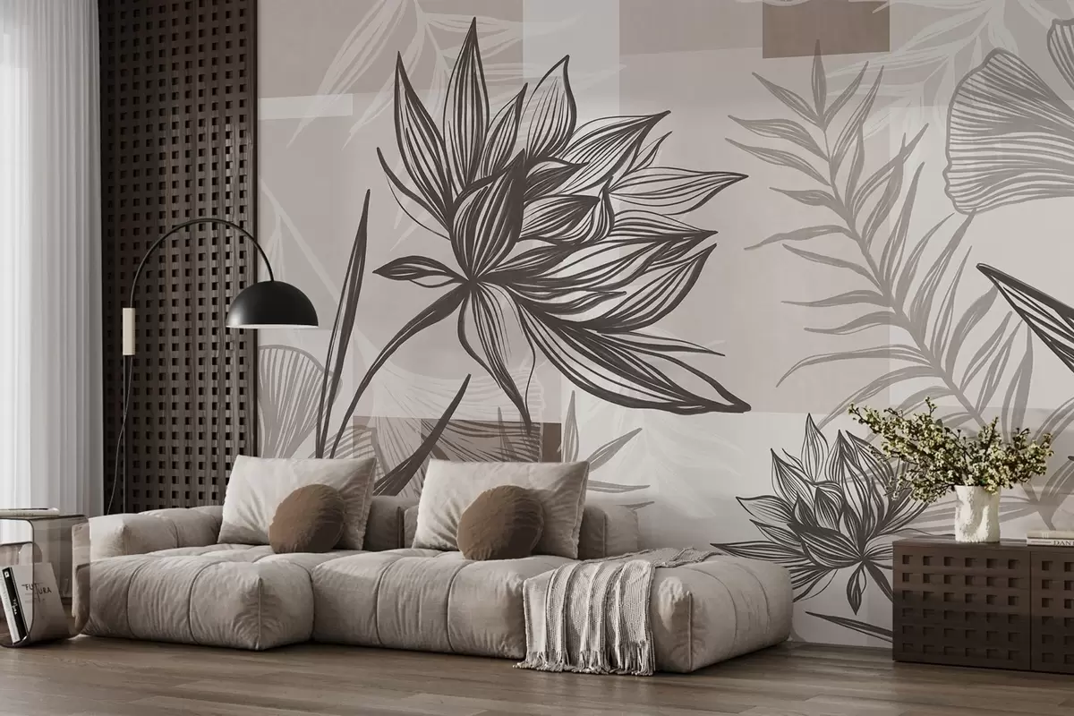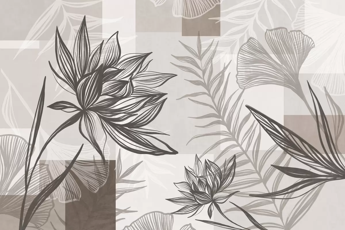 Wall murals Textured stylized flowers and leaves in shades of brown and beige, with a geometric background, line art Nr. w09629