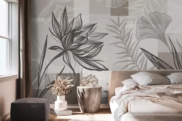 Wall murals Textured stylized flowers and leaves in shades of brown and beige, with a geometric background, line art Nr. w09629