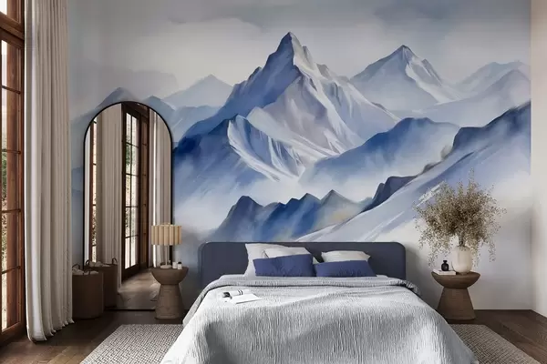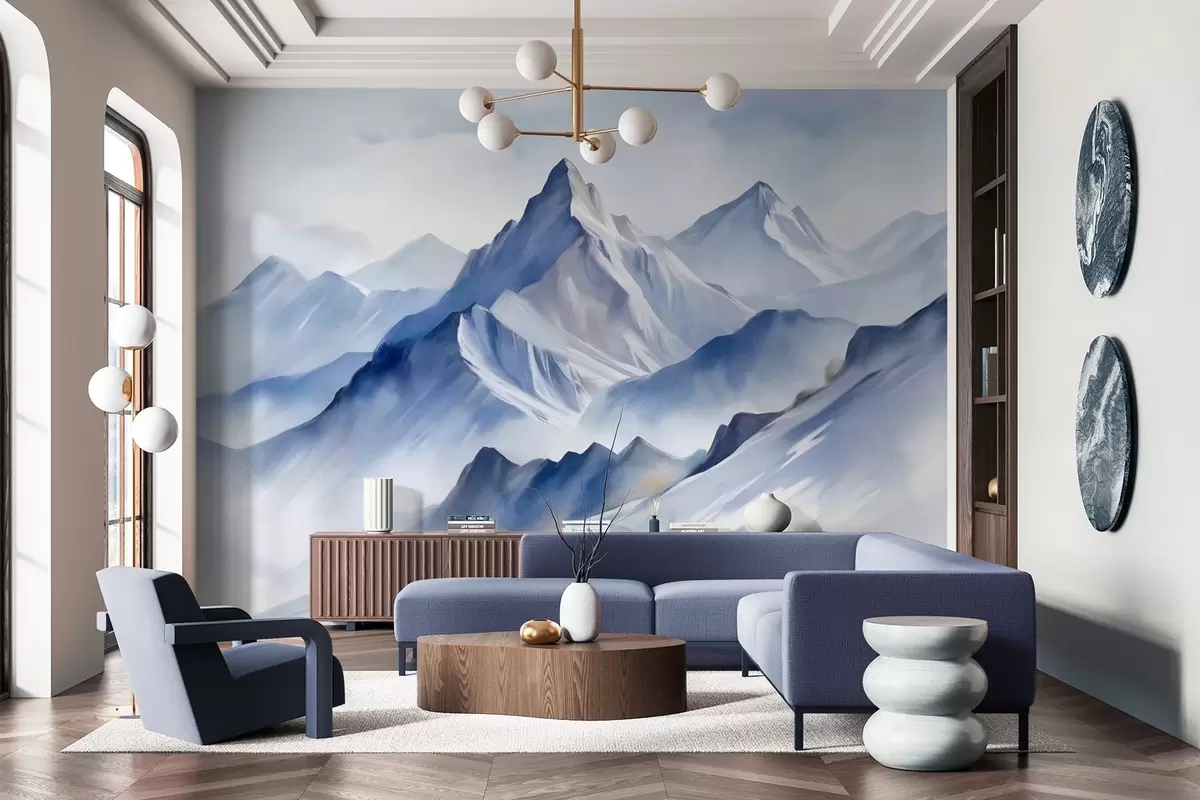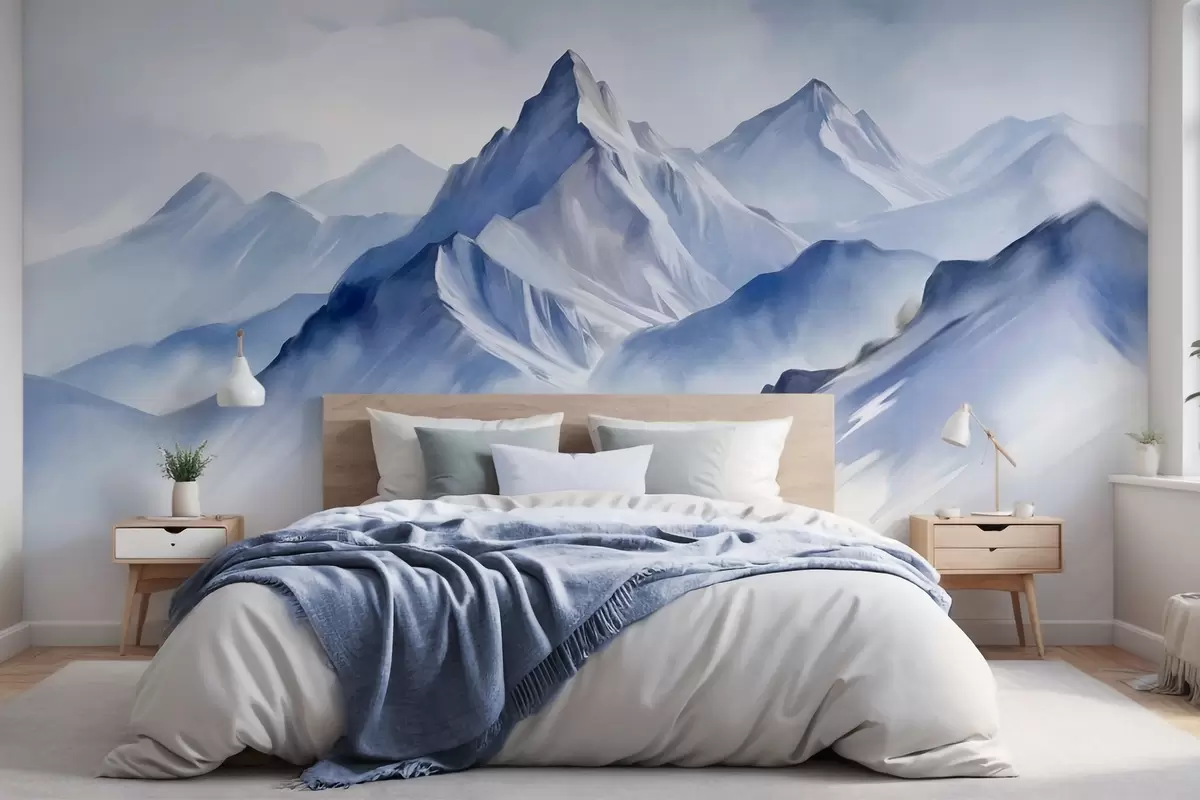 Wall murals Textured snowy mountains with a soft, watercolor effect and a palette of blue and white Nr. w09630