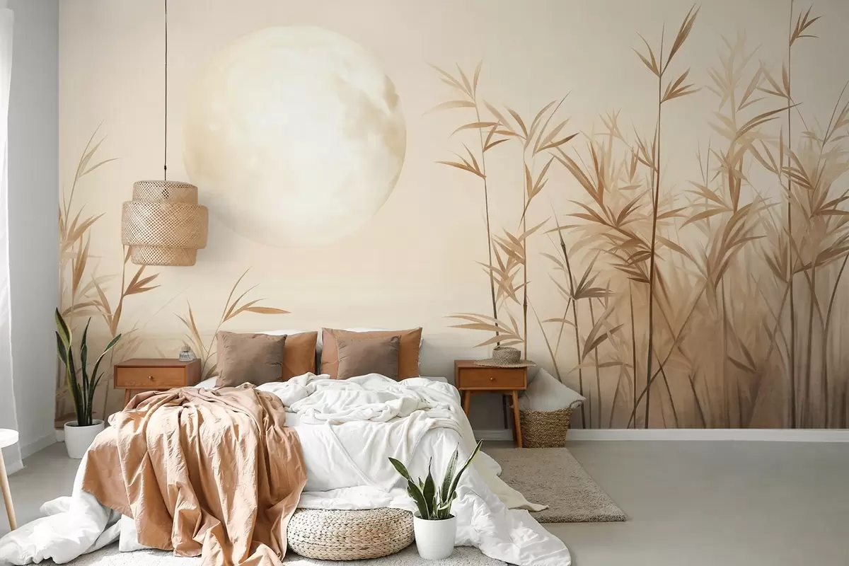 Wall murals Textured landscape with tall reeds, lake and pale moon in a hazy sky Nr. w09631