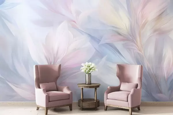 Wall murals Soft, pastel-colored leaves and feathers in shades of pink, blue and yellow, abstract and textured print Nr. w09634