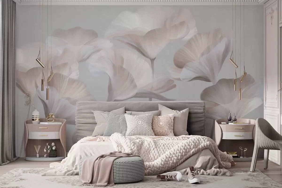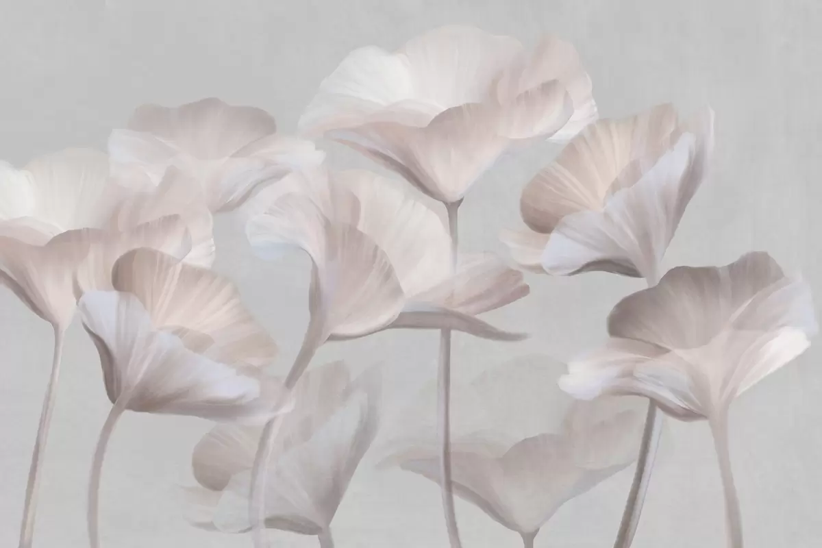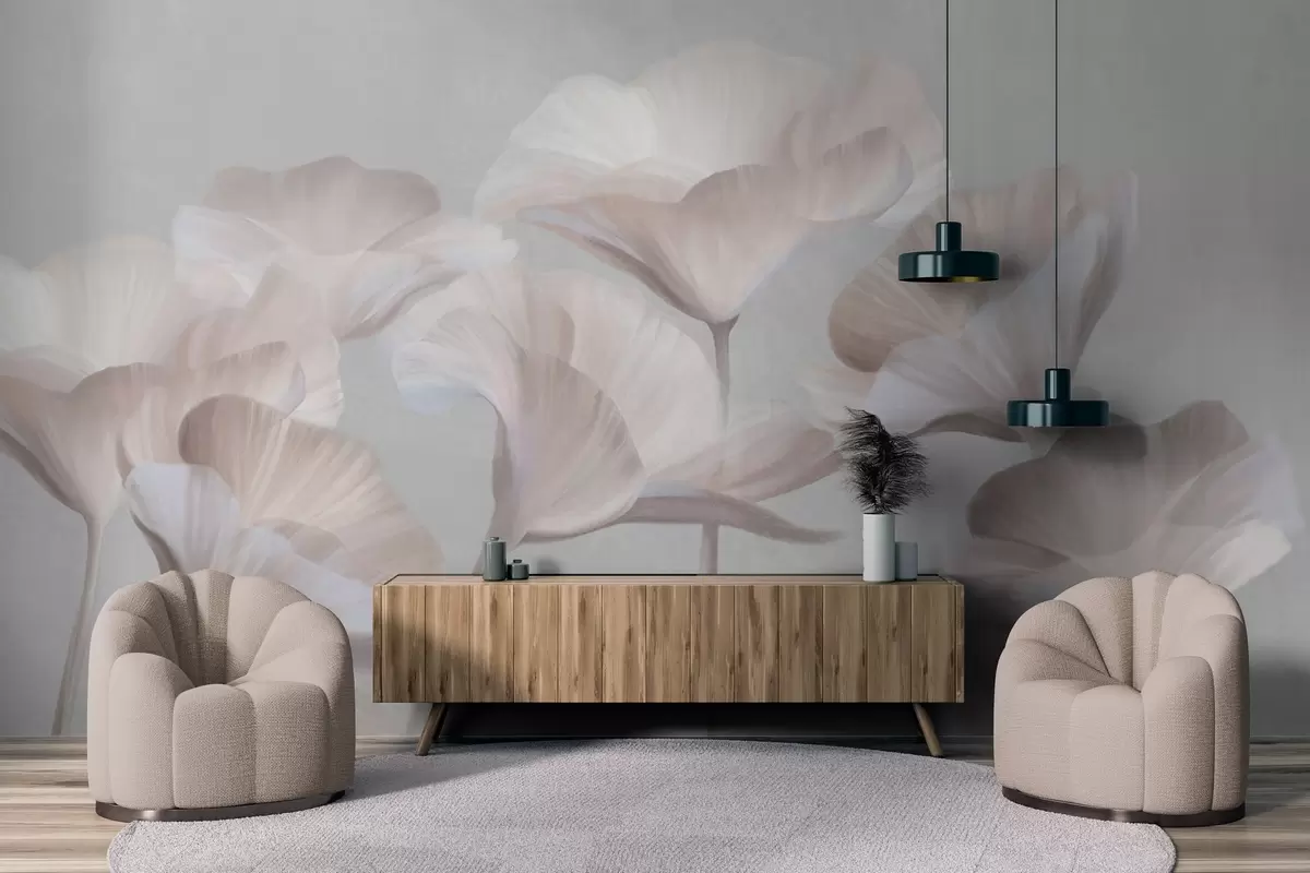 Wall murals Pale peach textured translucent lotus flowers with delicate petals against a muted gray background Nr. w09640