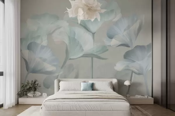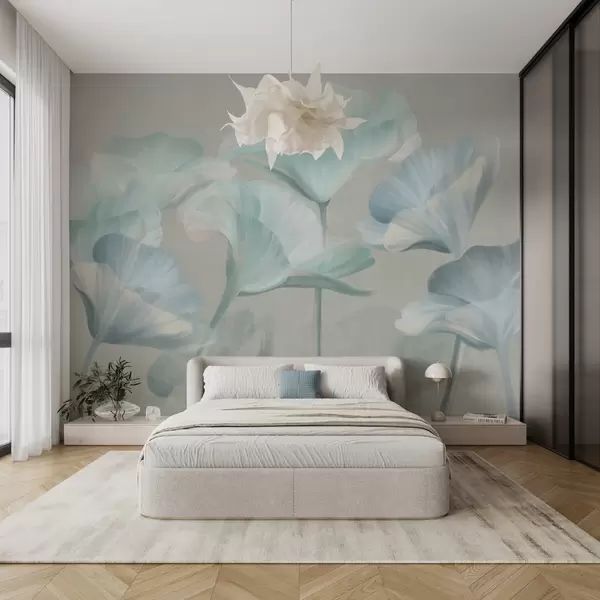 Wall murals Pale turquoise textured translucent lotus flowers with delicate petals against a muted gray background Nr. w09640v2