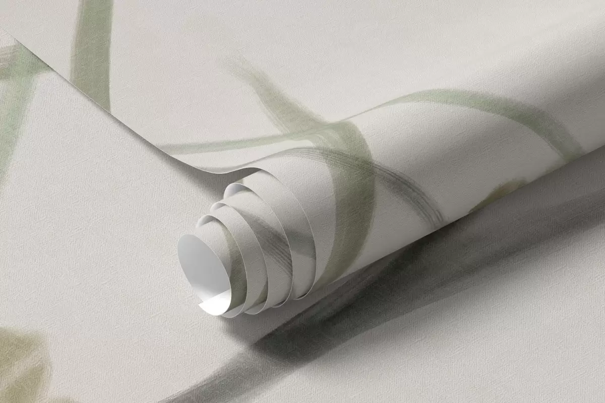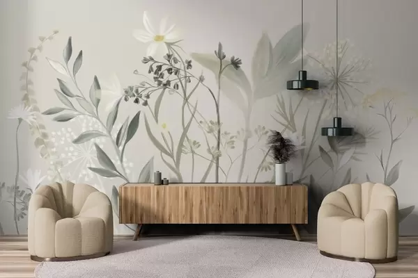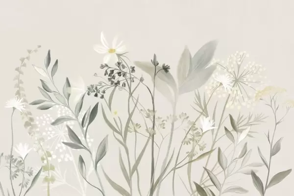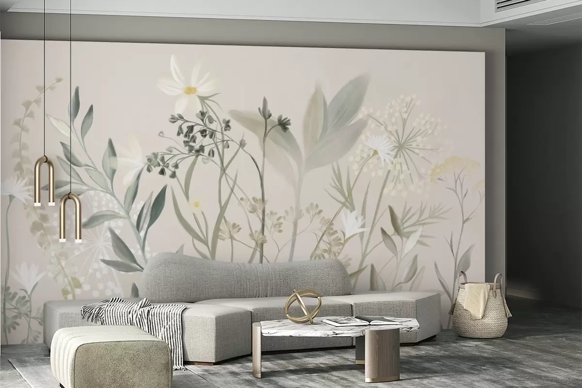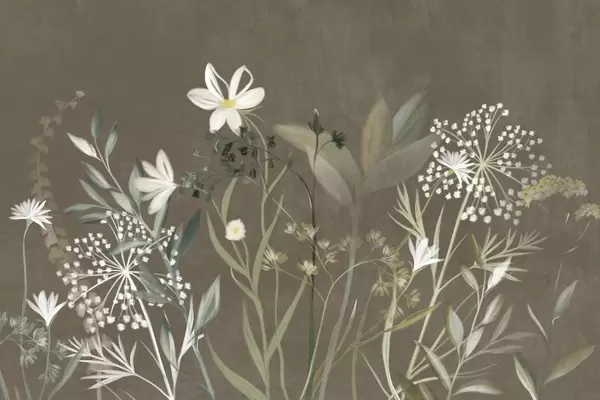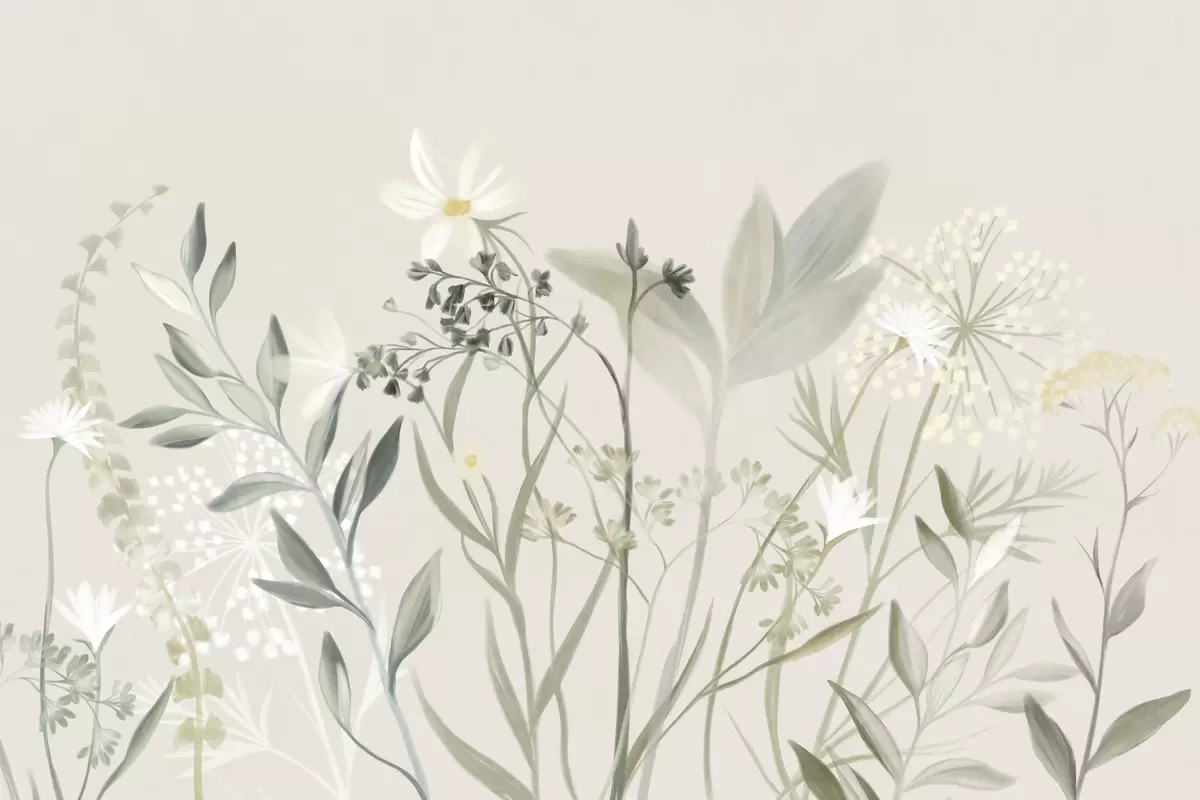 Wall murals Delicate textured wildflowers and foliage in muted green and cream tones against a soft beige background Nr. w09641