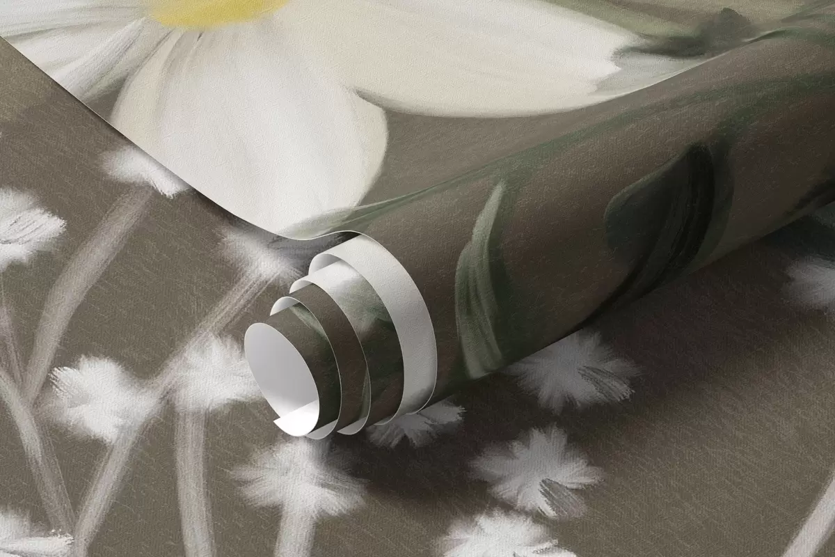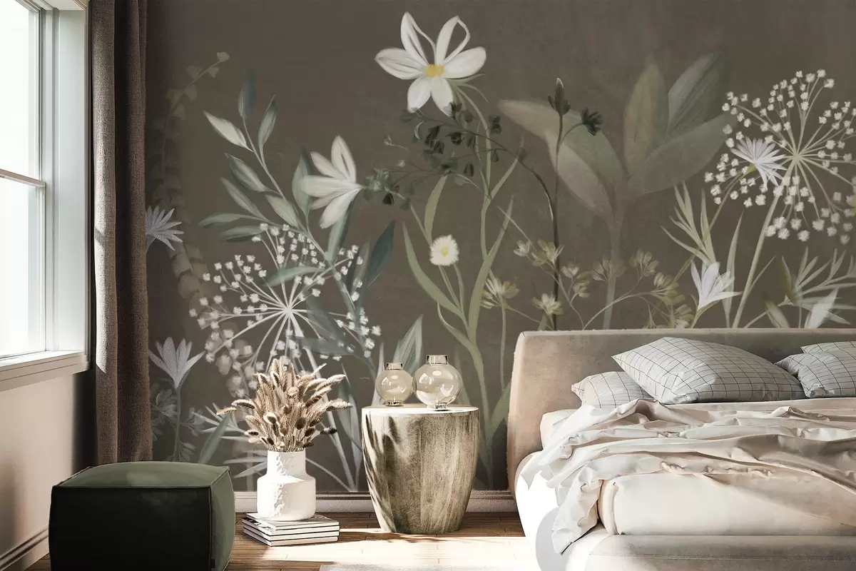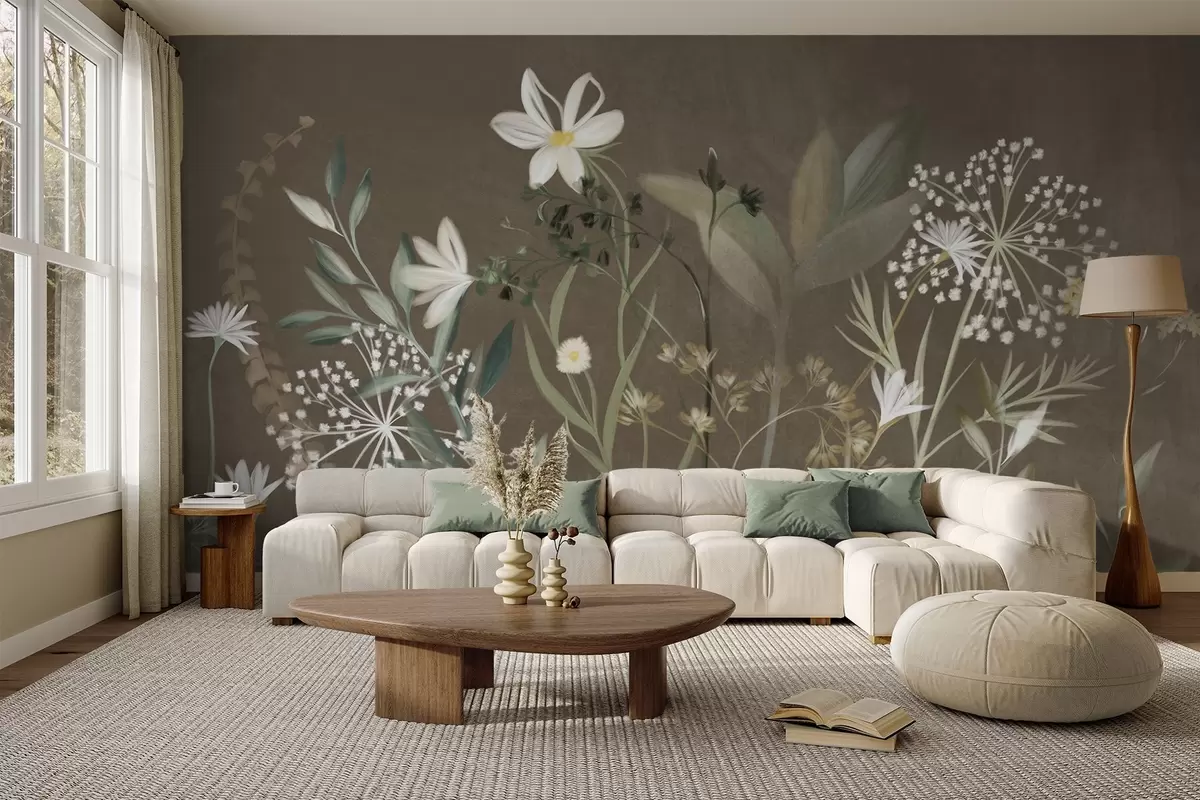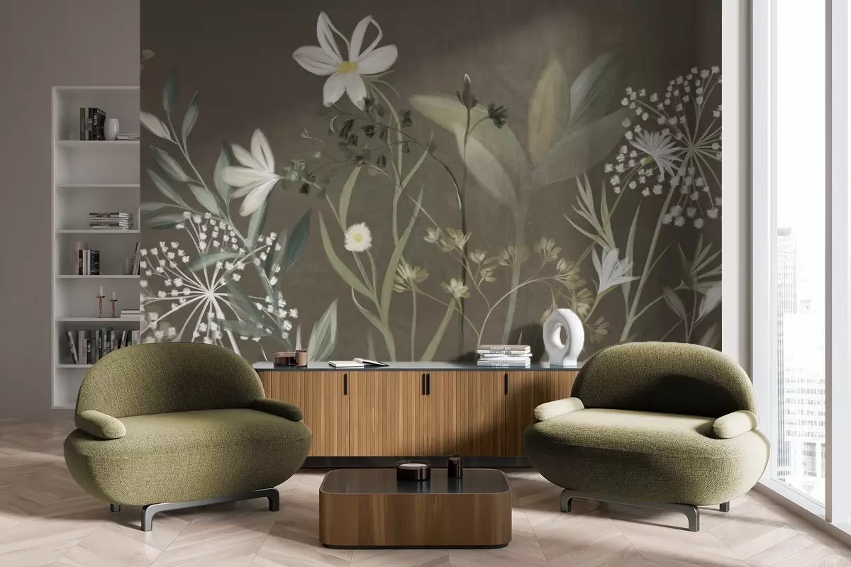 Wall murals Delicate textured wildflowers and foliage in muted green and cream tones against a brown background Nr. w09641v1