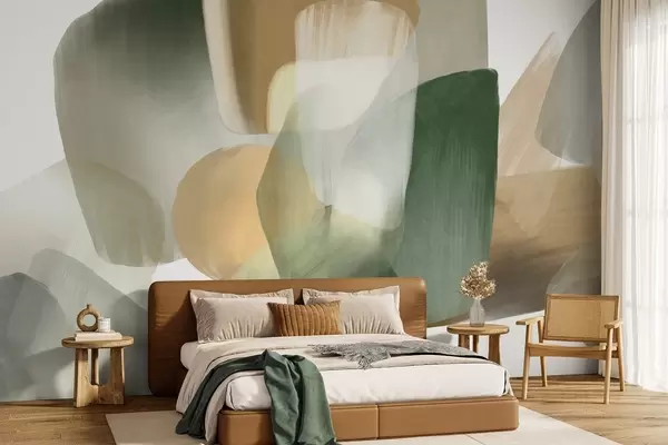 Wall murals Abstract texrured shapes in muted green and beige colors, with soft edges and overlapping layers Nr. w09642