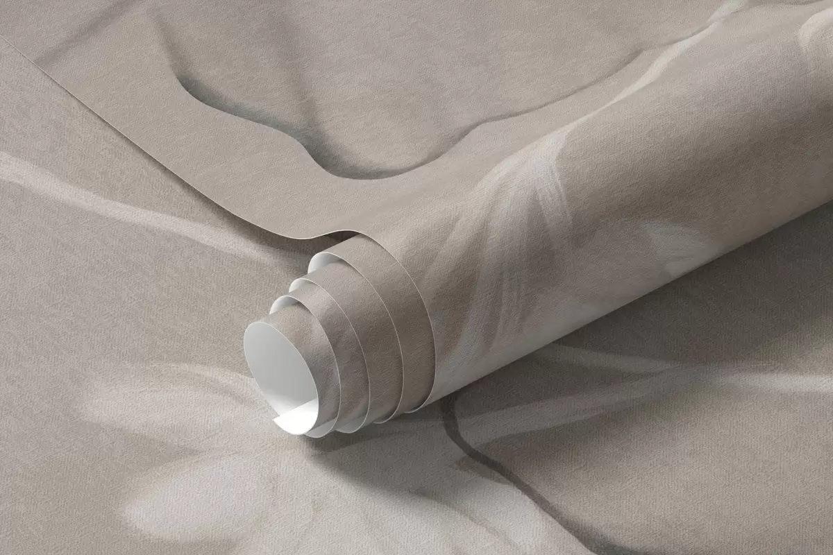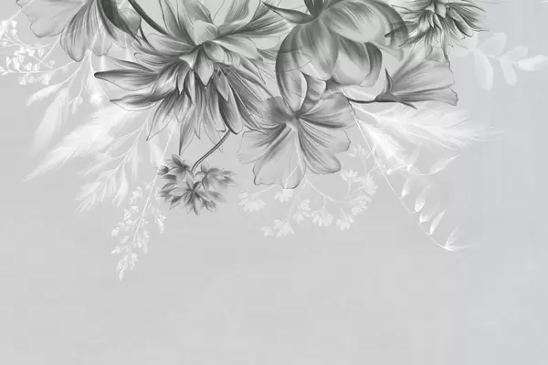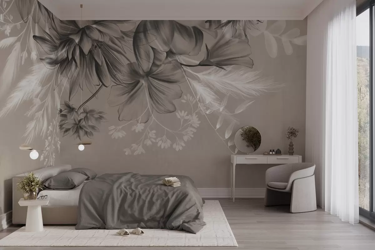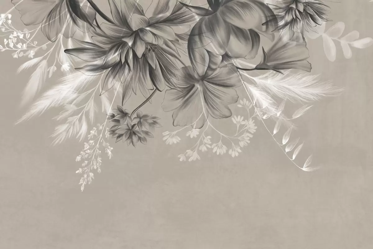 Wall murals Textured flowers and ferns in shades of dark gray and white against a muted beige background drawing style Nr. w09644