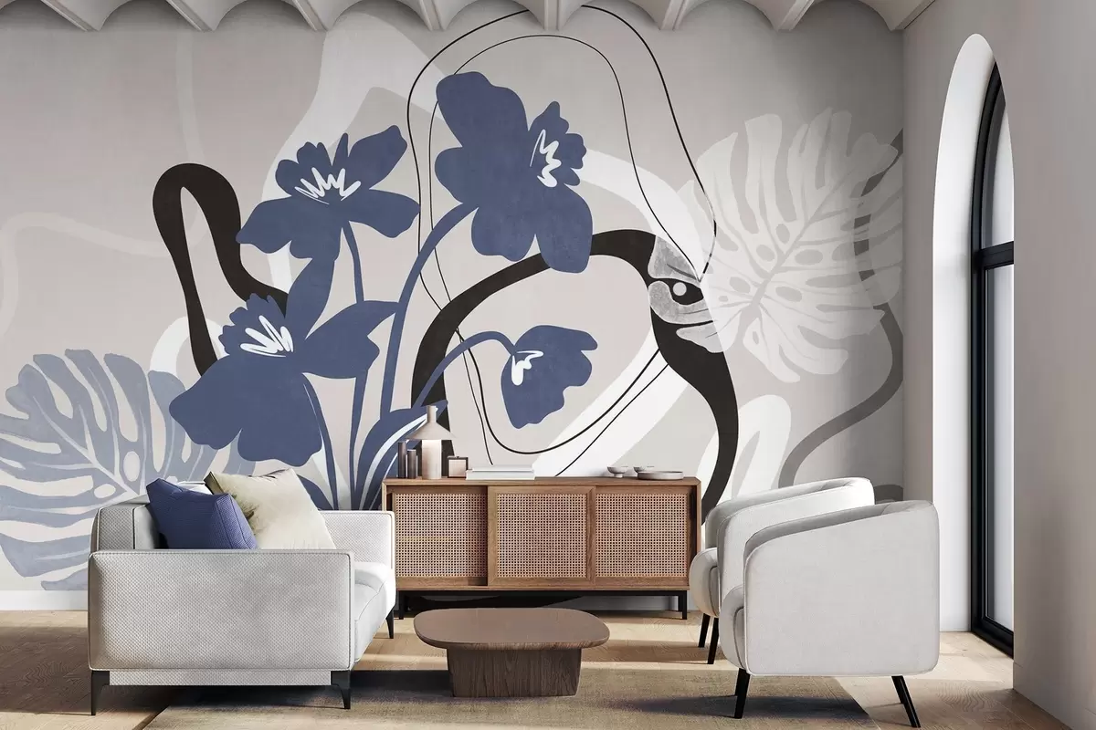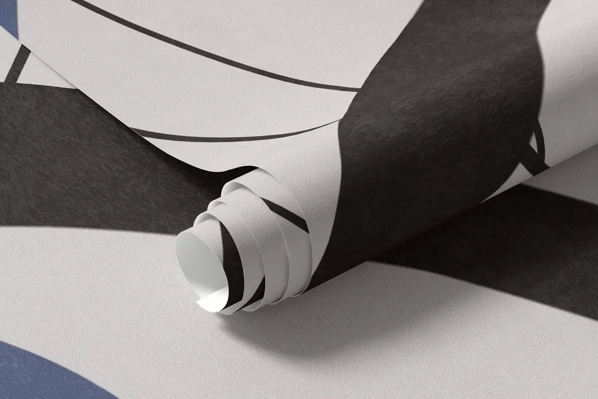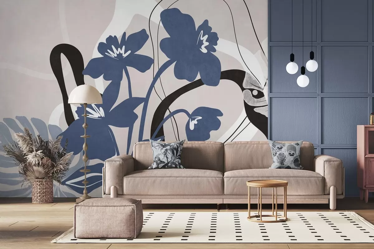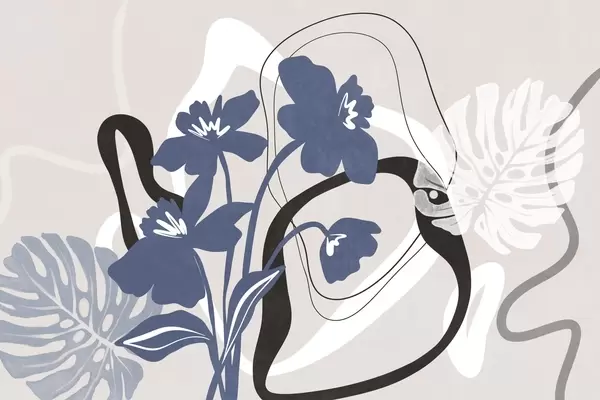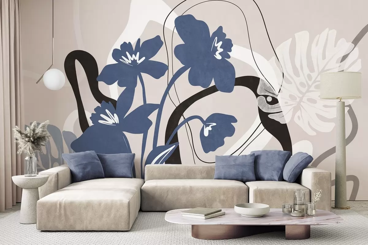 Wall murals Abstract textured blue flowers with white and black shapes against a light beige background, minimalist art Nr. w09645