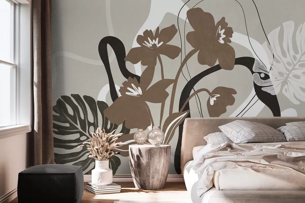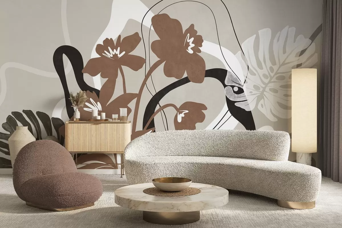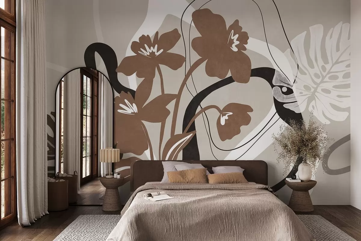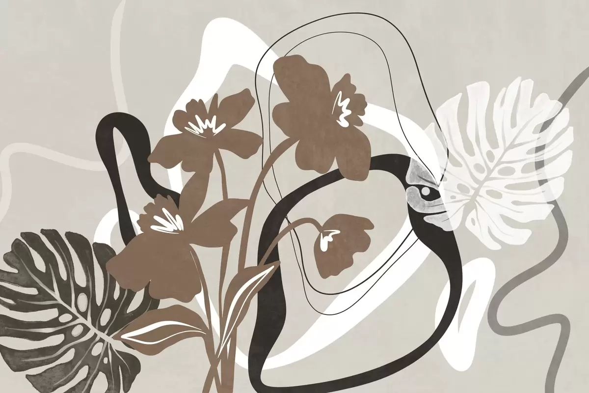 Wall murals Abstract textured brown flowers with white and black shapes against a beige background, minimalist art Nr. w09645v1
