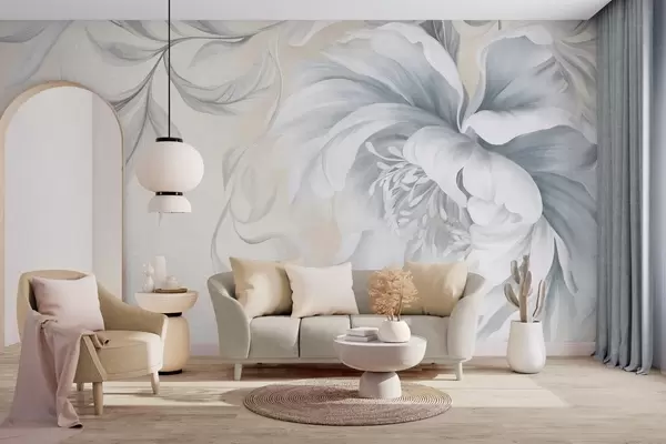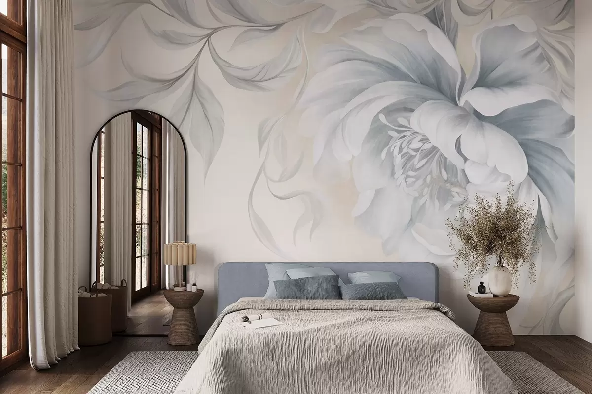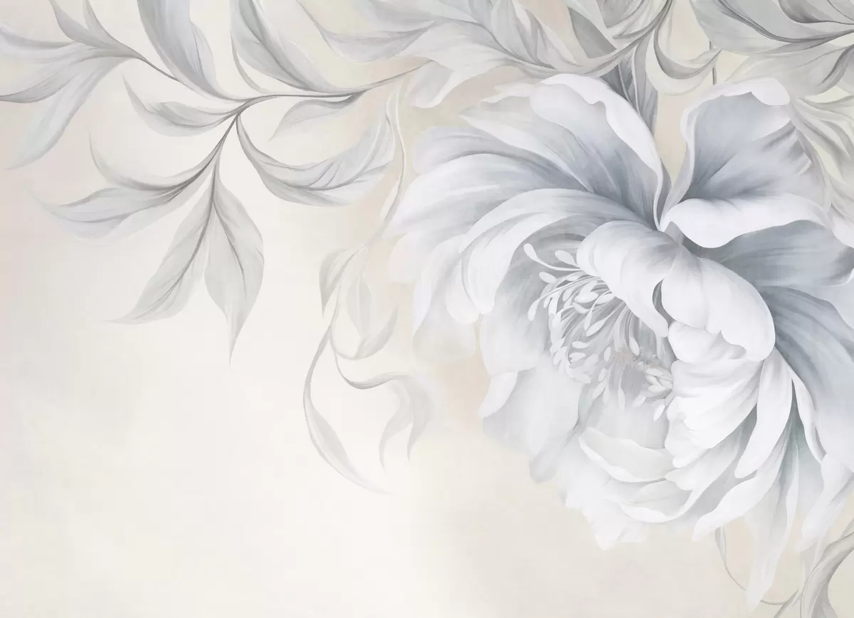 Wall murals Large, textured peony with delicate petals and gray leaves, painted soft style Nr. w09647