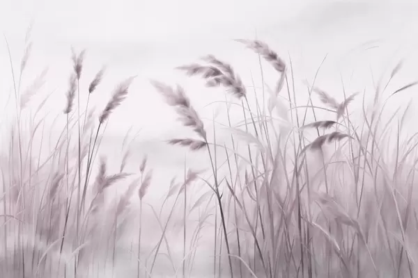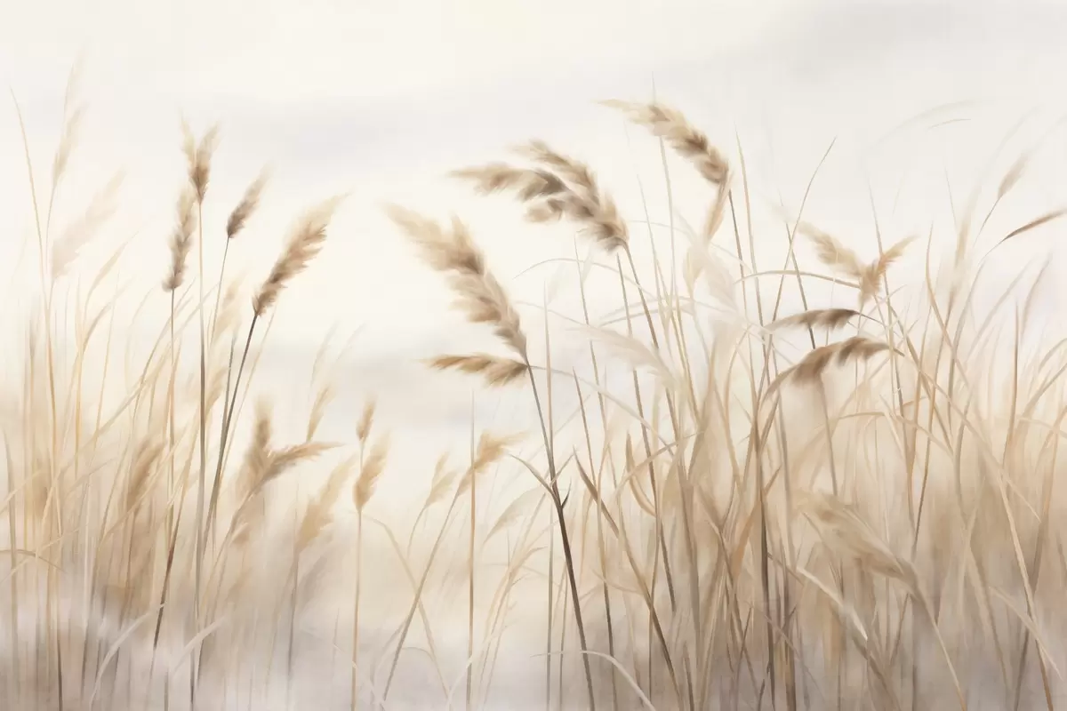 Wall murals Tall, textured dry grass with ears of wheat in the field against a soft, pale background Nr. w09648