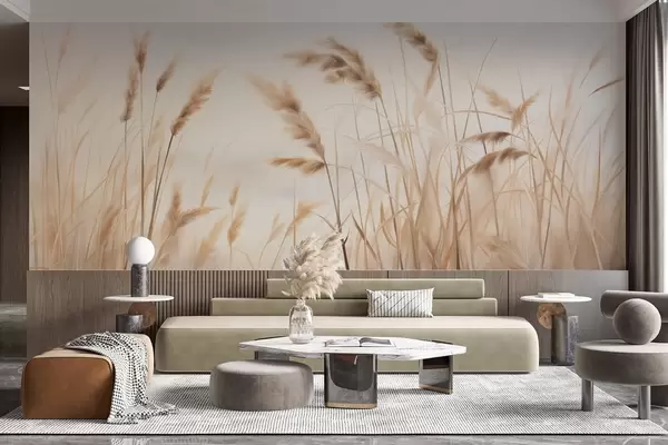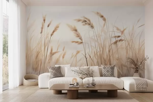 Wall murals Tall, textured dry grass with ears of wheat in the field against a soft, pale background Nr. w09648
