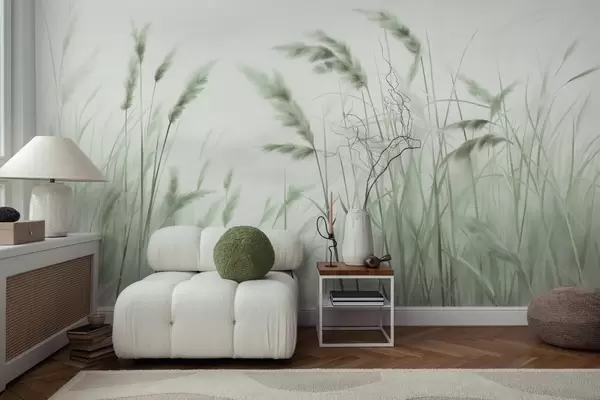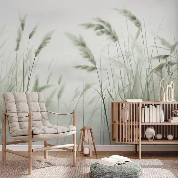 Wall murals Tall, textured dry grass with ears of wheat in the field against a soft, pale background Nr. w09648v1