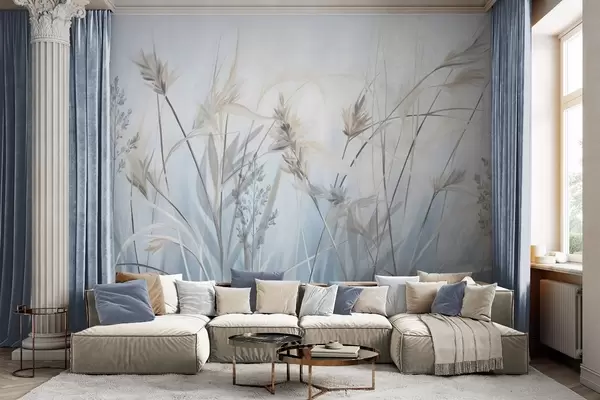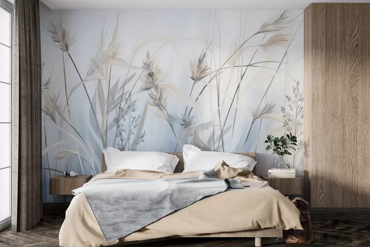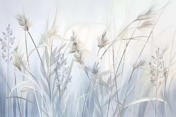 Wall murals Tall, dry grass stalks with feathery tops in muted tones, soft, hazy blue and white background Nr. w09652
