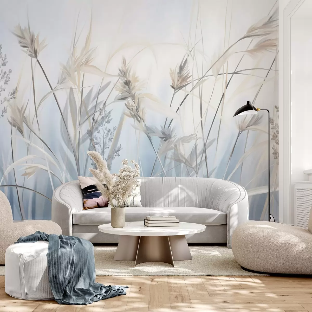 wall murals Tall, dry grass stalks with feathery tops in muted tones, soft, hazy blue and white background w09652