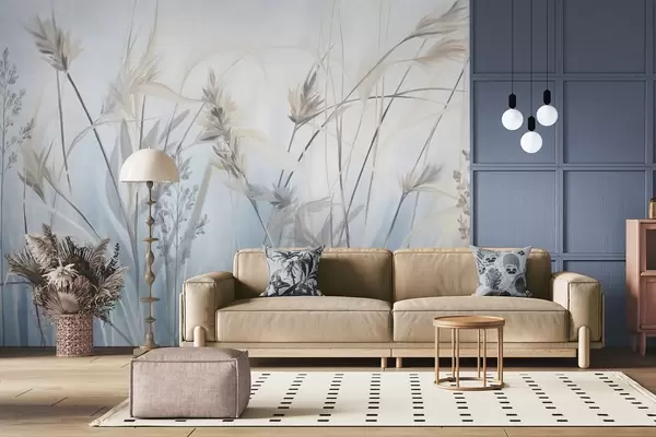 Wall murals Tall, dry grass stalks with feathery tops in muted tones, soft, hazy blue and white background Nr. w09652