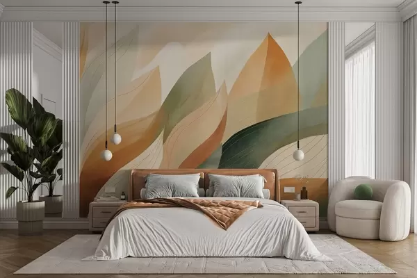 Wall murals Abstract leaves, muted earth tones of green, orange with delicate line details , soft watercolor texture Nr. w09736