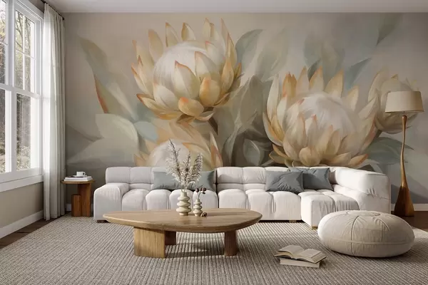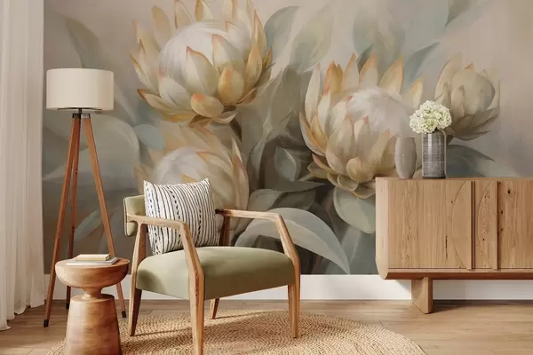 Wall murals Textured protea flowers with green leaves and a soft, blurred background Nr. w09738