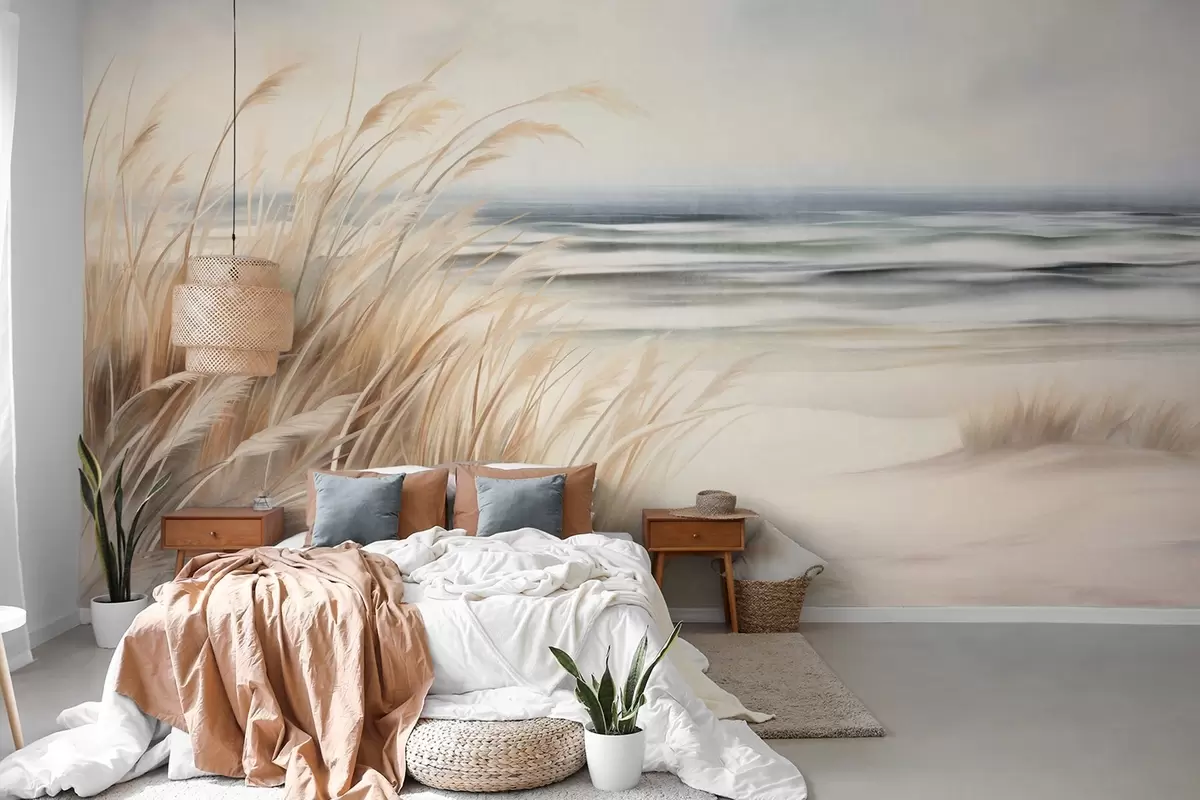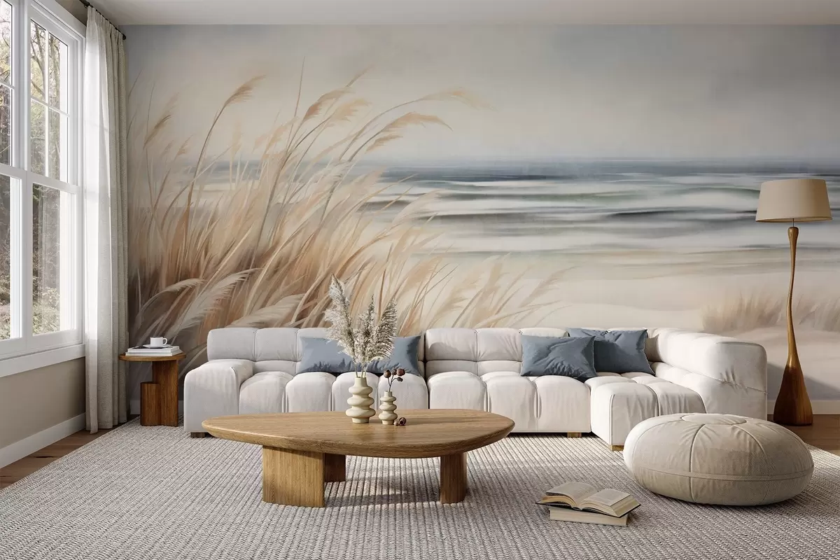 Wall murals Textured landscape with dry grass on a sandy beach, with the ocean and sky in the background Nr. w09739