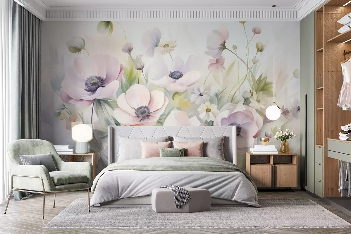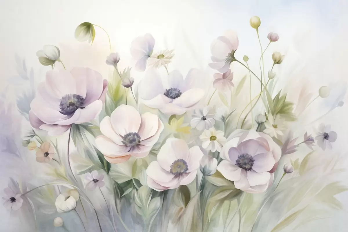 Wall murals A field of pastel pink and white anemone flowers, green foliage and small white daisies Nr. w09742