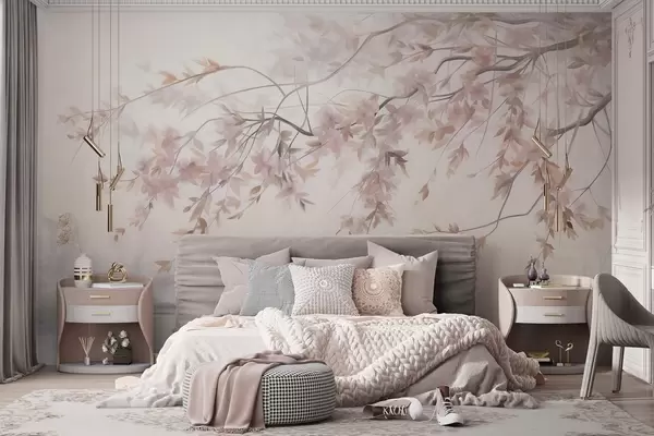 Wall murals Textured landscape with cherry blossom branch, pink leaves, soft, foggy background Nr. w09743