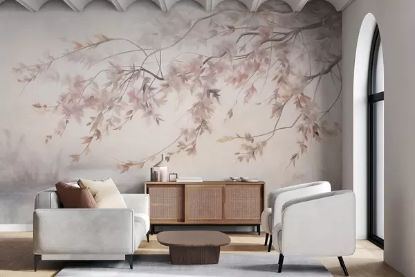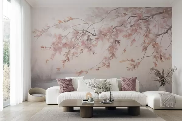 Wall murals Textured landscape with cherry blossom branch, pink leaves, soft, foggy background Nr. w09743