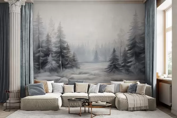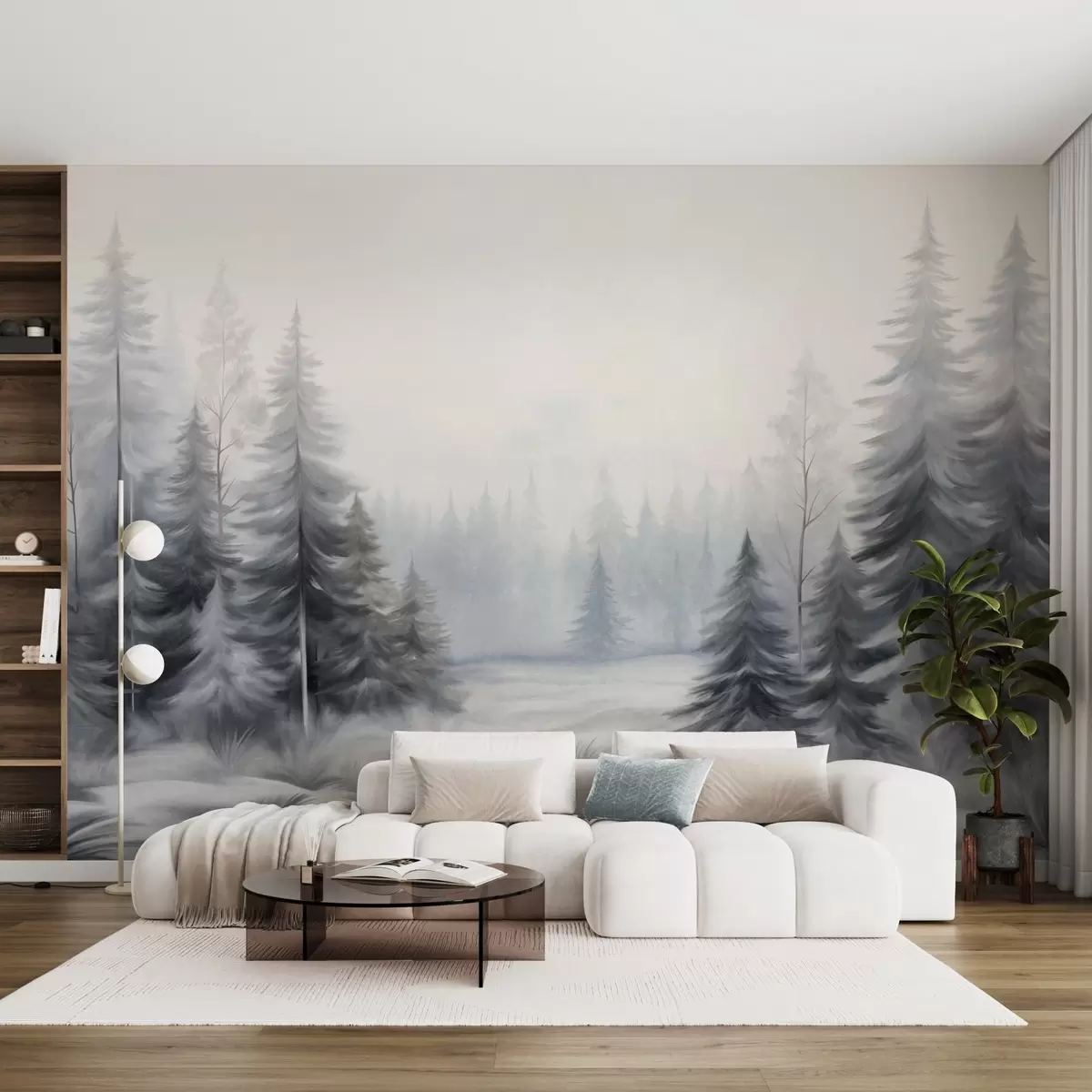 Wall murals Textured winter forest trees in mist, in muted gray and white tones Nr. w09745