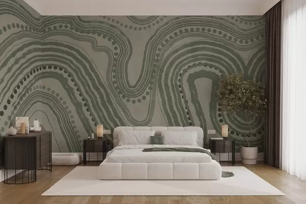 Wall murals Abstract green and beige wavy lines and dots, modern textured art Nr. w09747