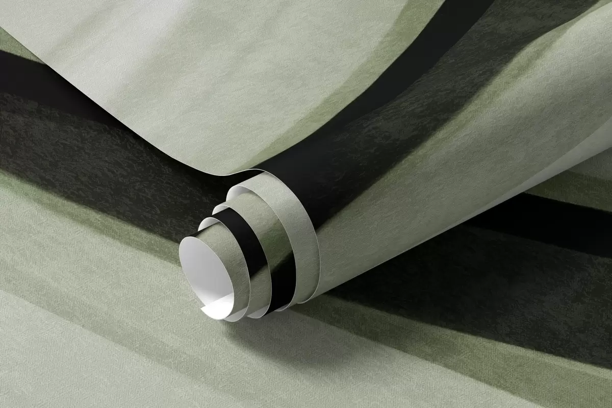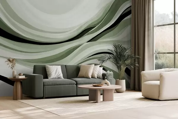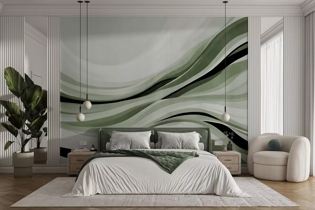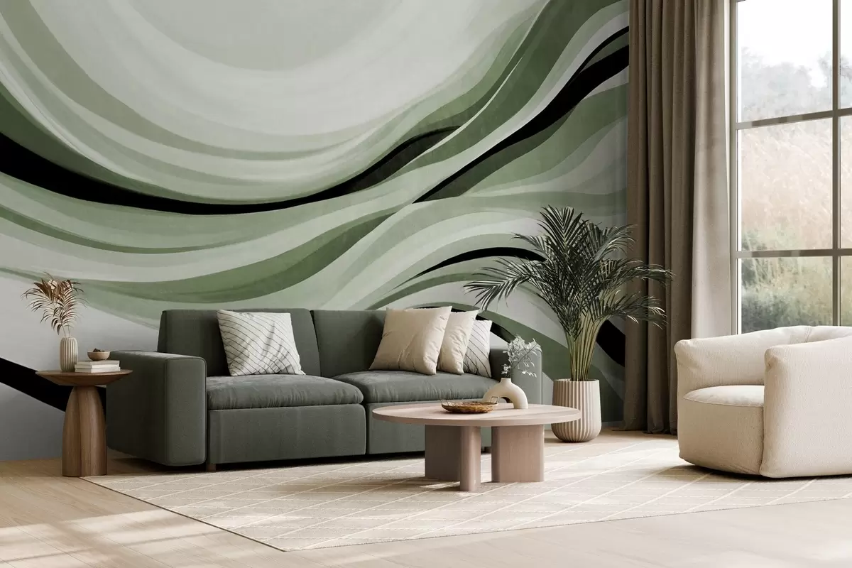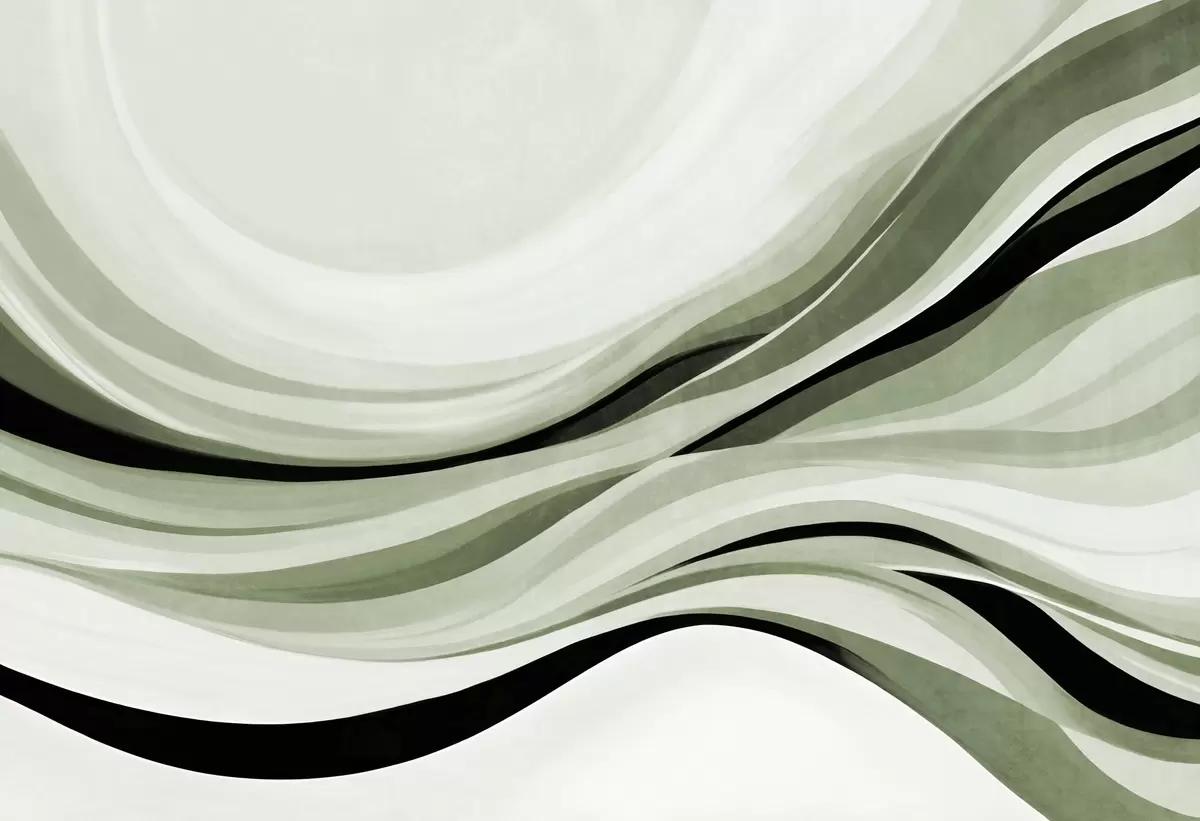 Wall murals Abstract wavy lines in shades of green and black against a light background, textured art Nr. w09748v1