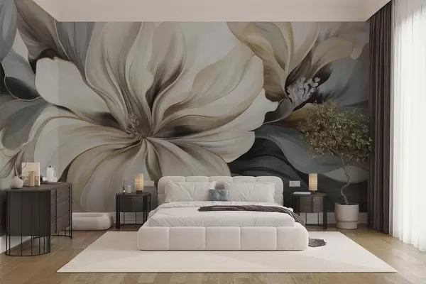 Wall murals Large, creamy magnolia flowers with brown and grey leaves, soft lighting, abstract background Nr. w09749