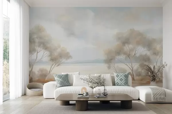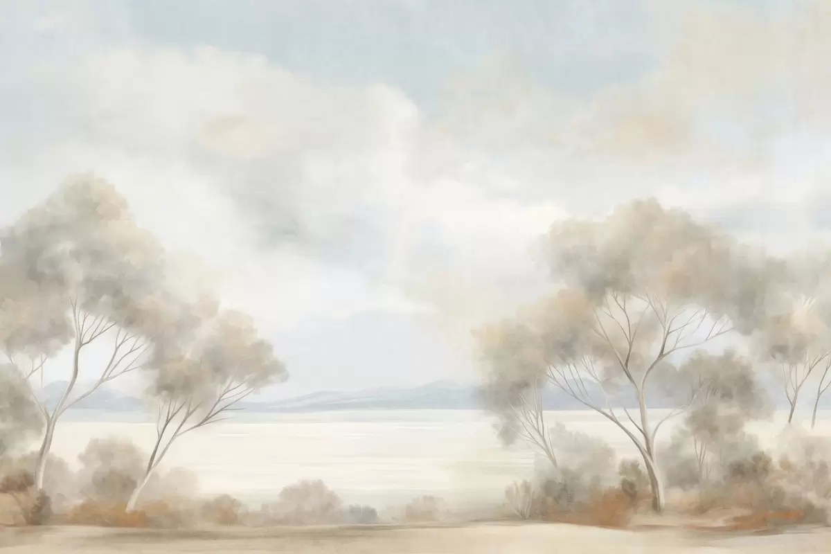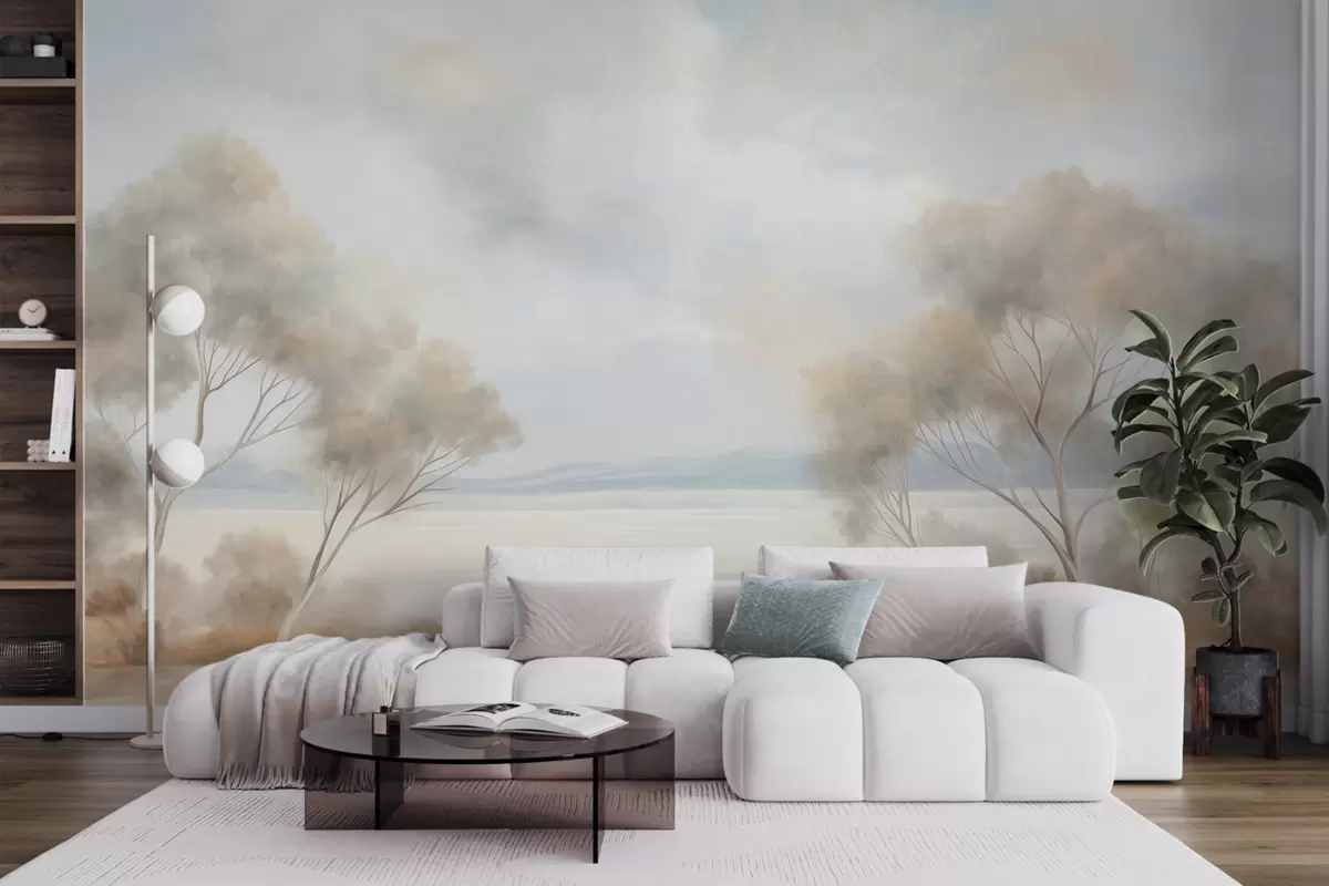 Wall murals A landscape textured painting style with trees under a cloudy sky Nr. w09753