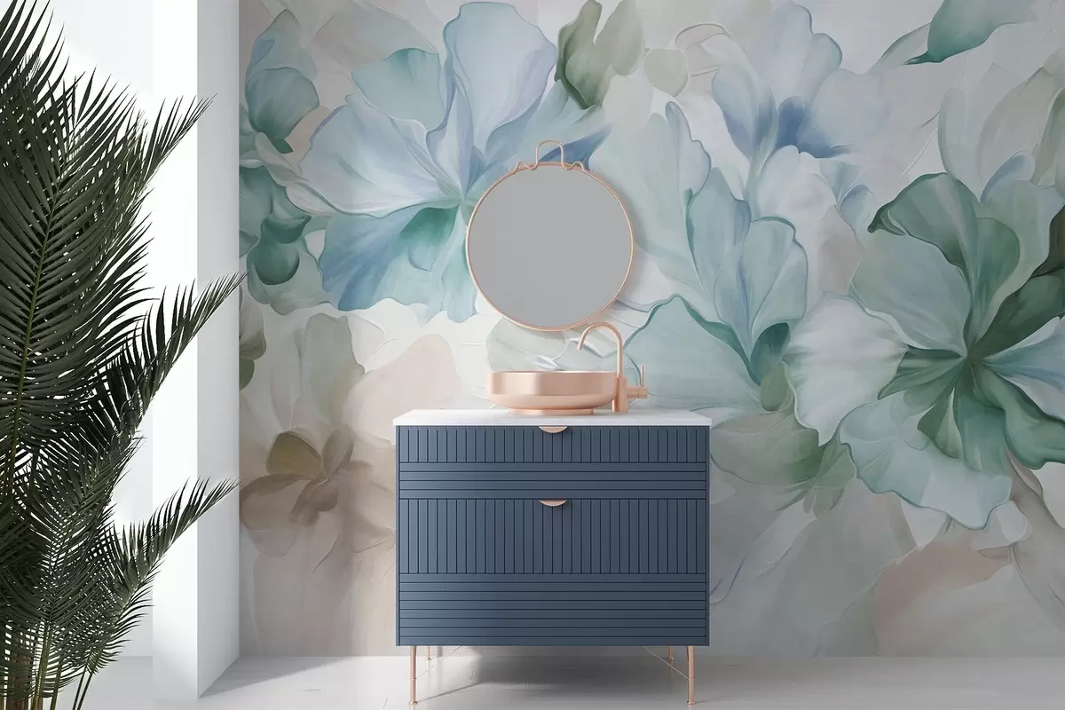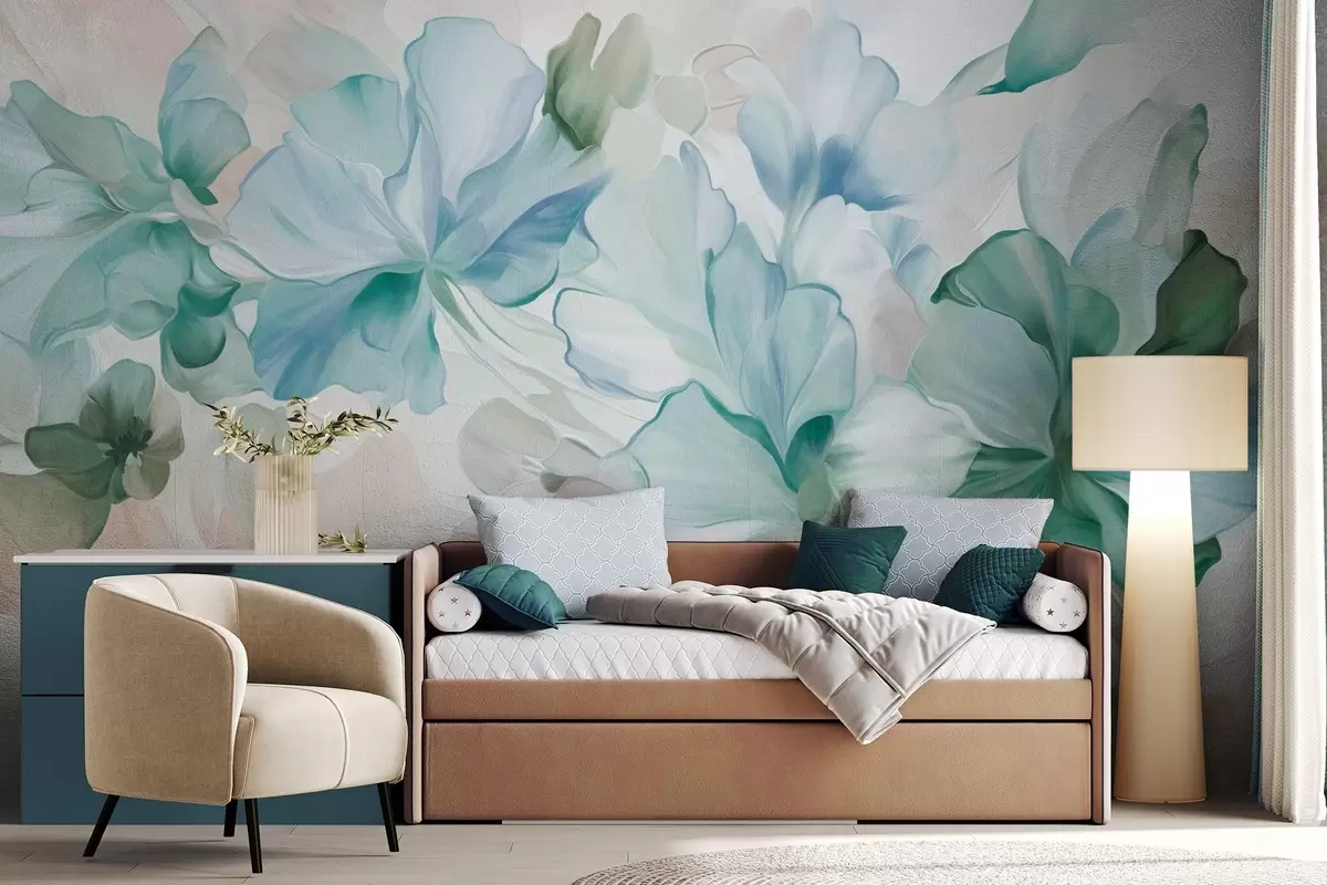 Wall murals Abstract fantasy flowers in shades of green, blue and beige in painting style, textured art Nr. w09767v1
