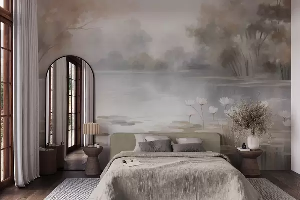 Wall murals Textured landscape, lake with white water lilies, surrounded by trees in muted colors Nr. w09768