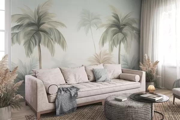 Wall murals Palm textured trees with muted green and beige fronds against a soft sky Nr. w09770