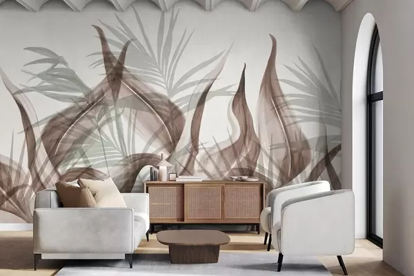 Wall murals Tropical leaves in shades of brown and green against a white background, textured watercolor style Nr. w09772