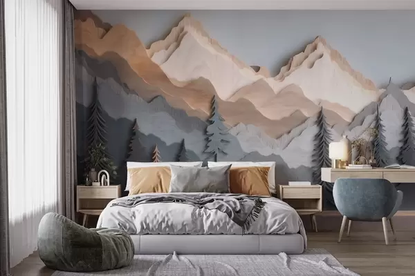 Wall murals Natural landscape with pine trees and mountains in carved wood style Nr. w09793