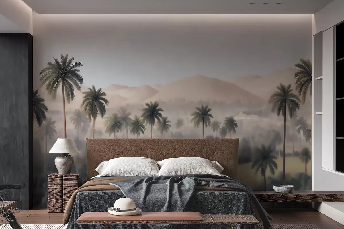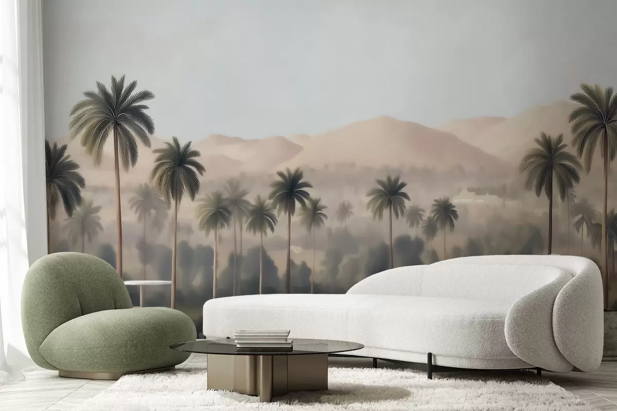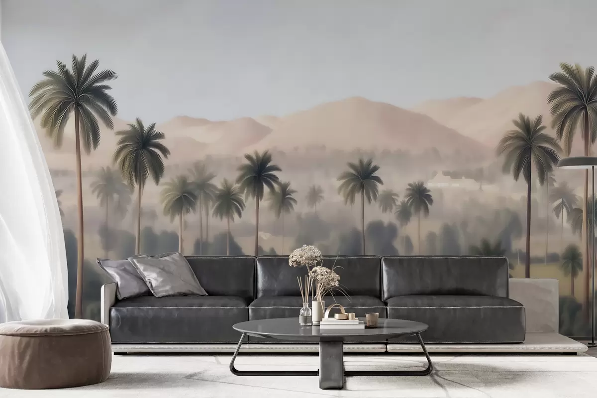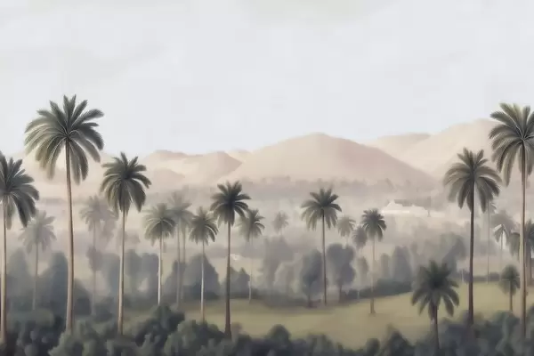 Wall murals Tropical landscape with palm trees and mountains, vintage panorama in beige and green tones Nr. w09798