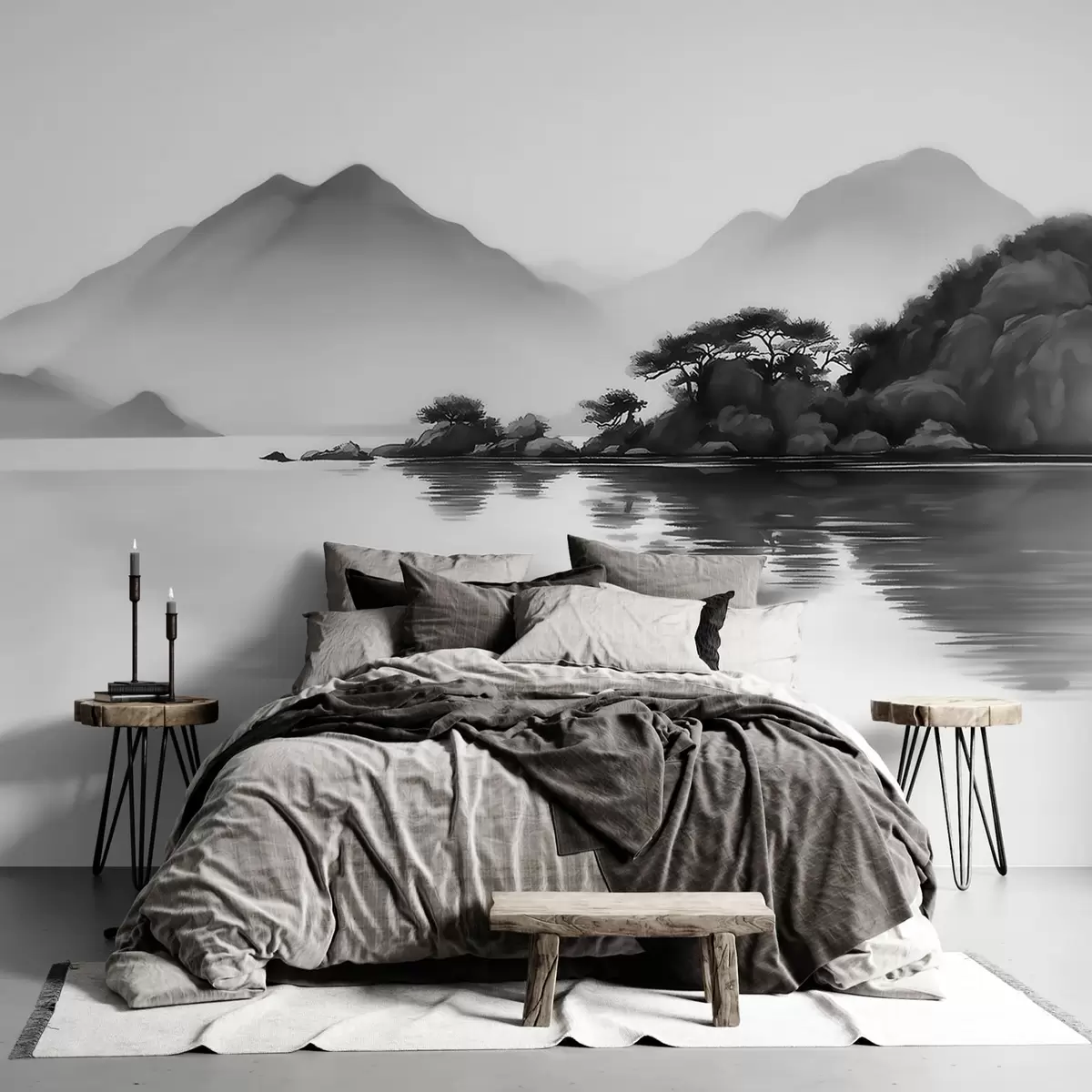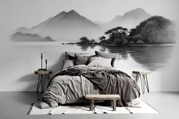 Wall murals Black and white landscape with mountains and lake in soft mist Nr. w09803
