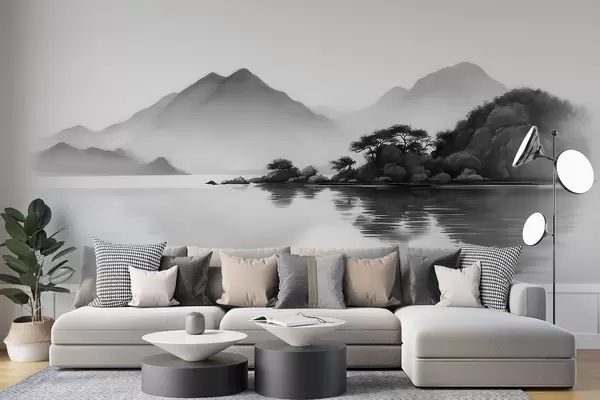 Wall murals Black and white landscape with mountains and lake in soft mist Nr. w09803