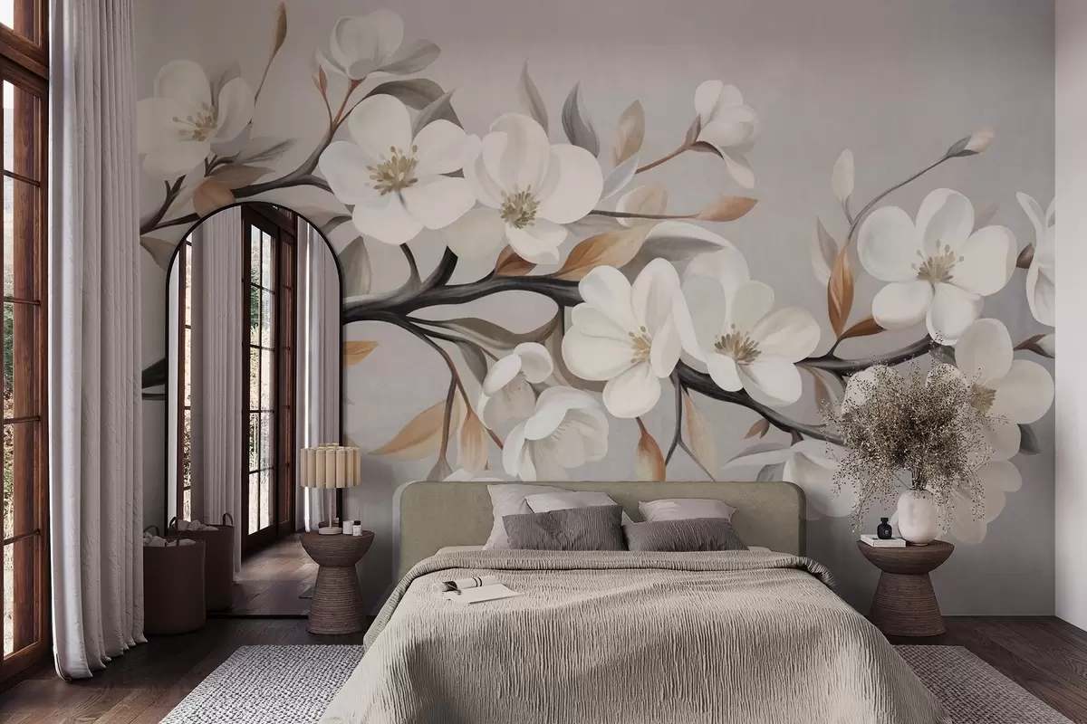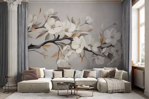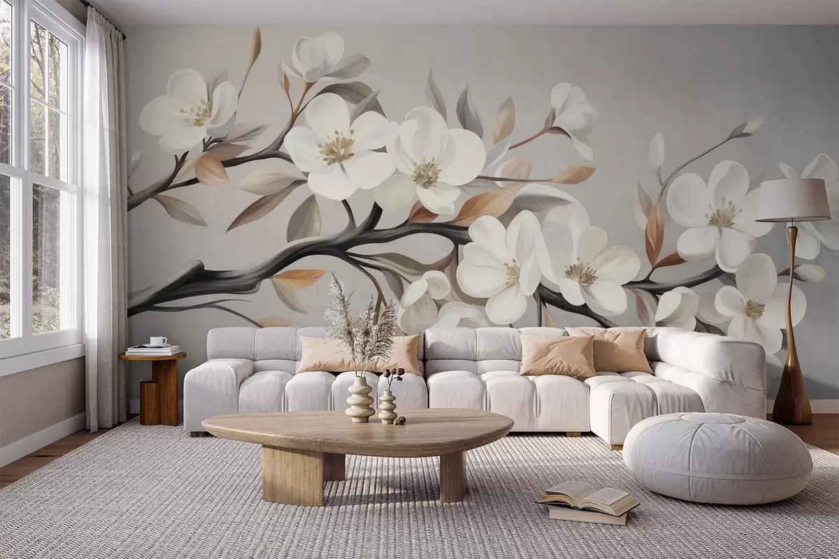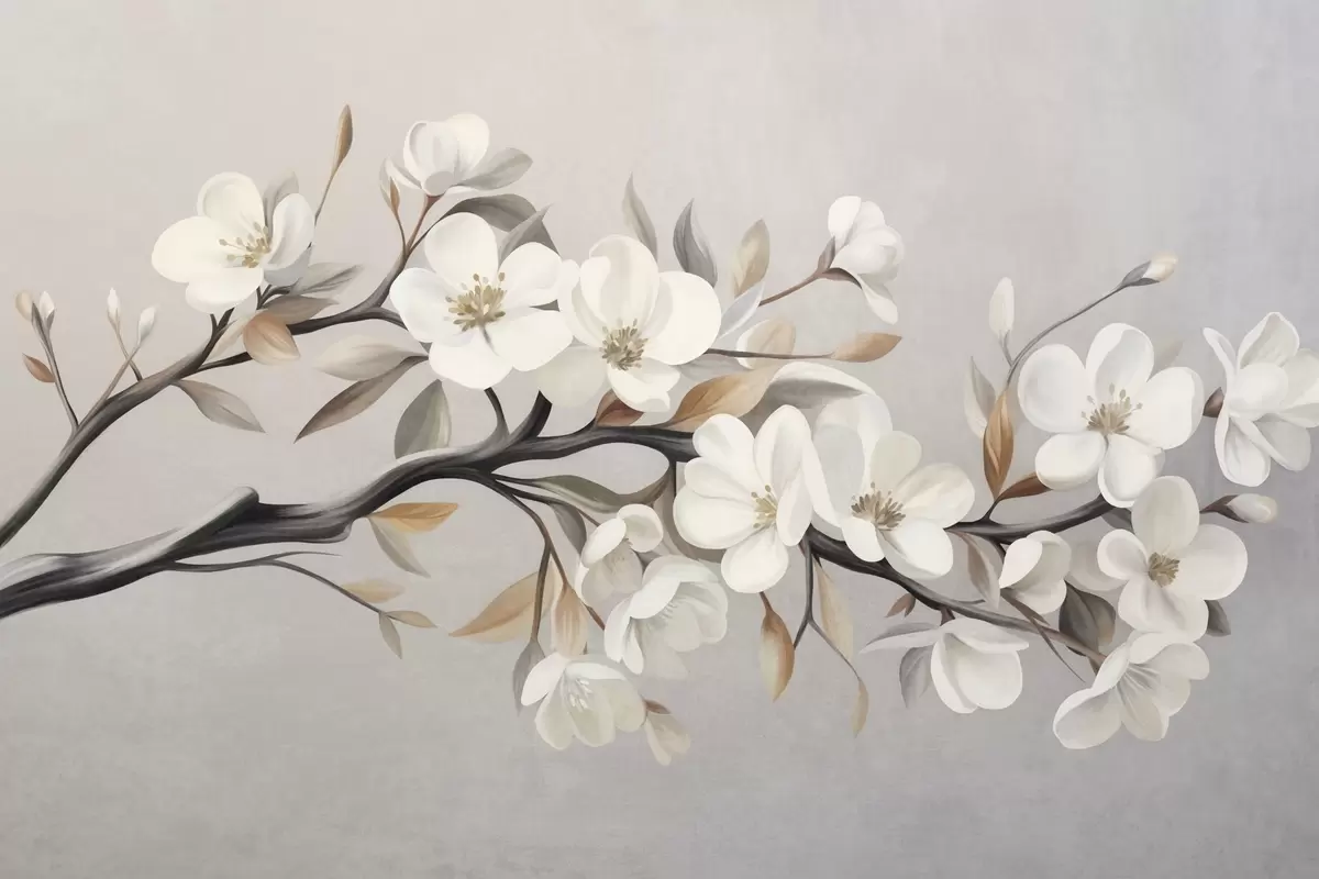 Wall murals Textured branch with white flowers and brown leaves against a light gray background Nr. w09817