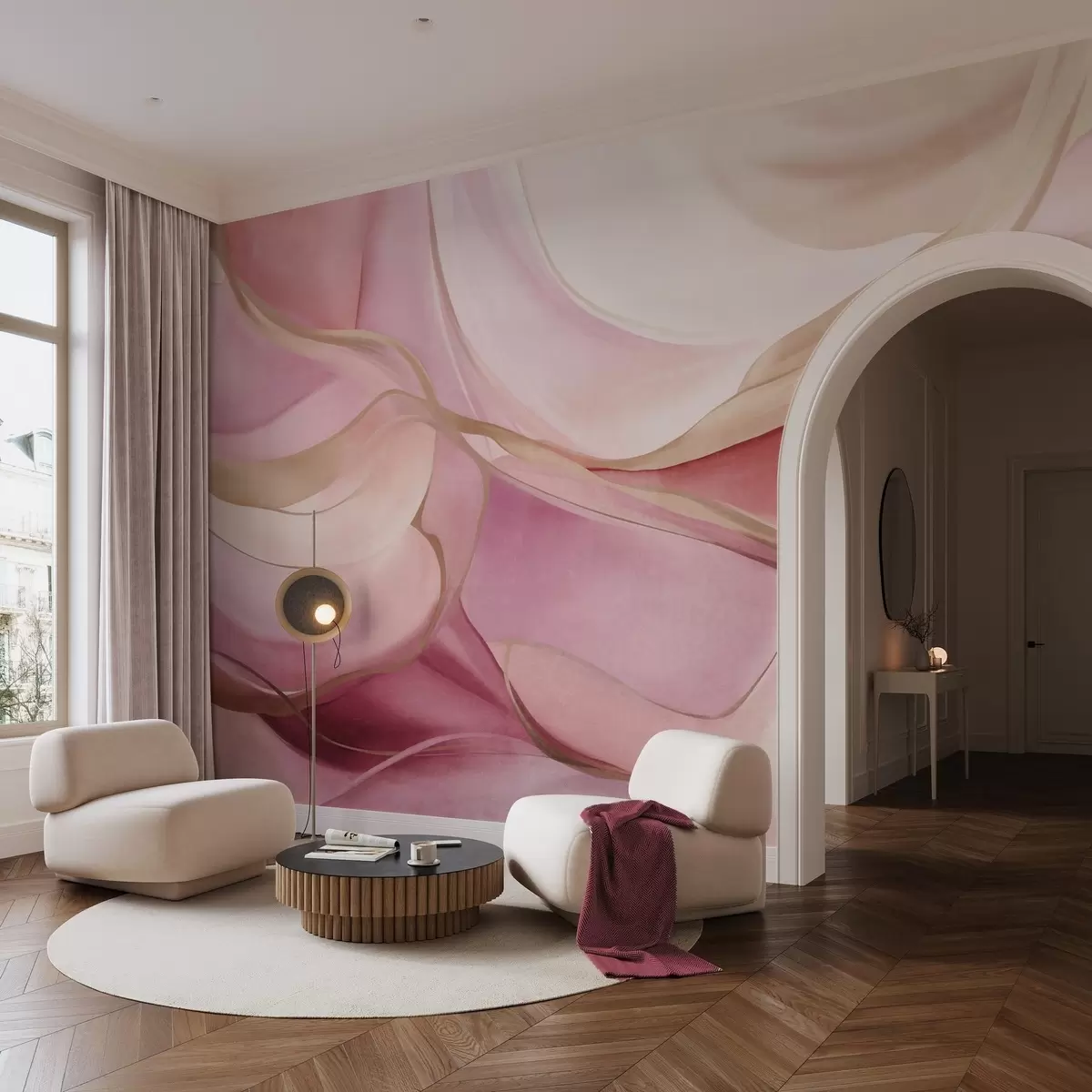 Wall murals Abstract textured flowing shapes in shades of pink and beige with delicate yellow lines Nr. w09818
