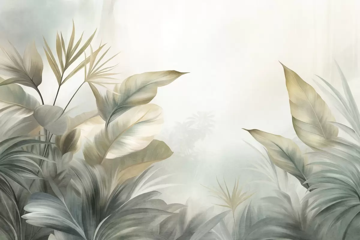 Wall murals Large, textured tropical leaves in muted green and beige tones, a jungle environment Nr. w09820
