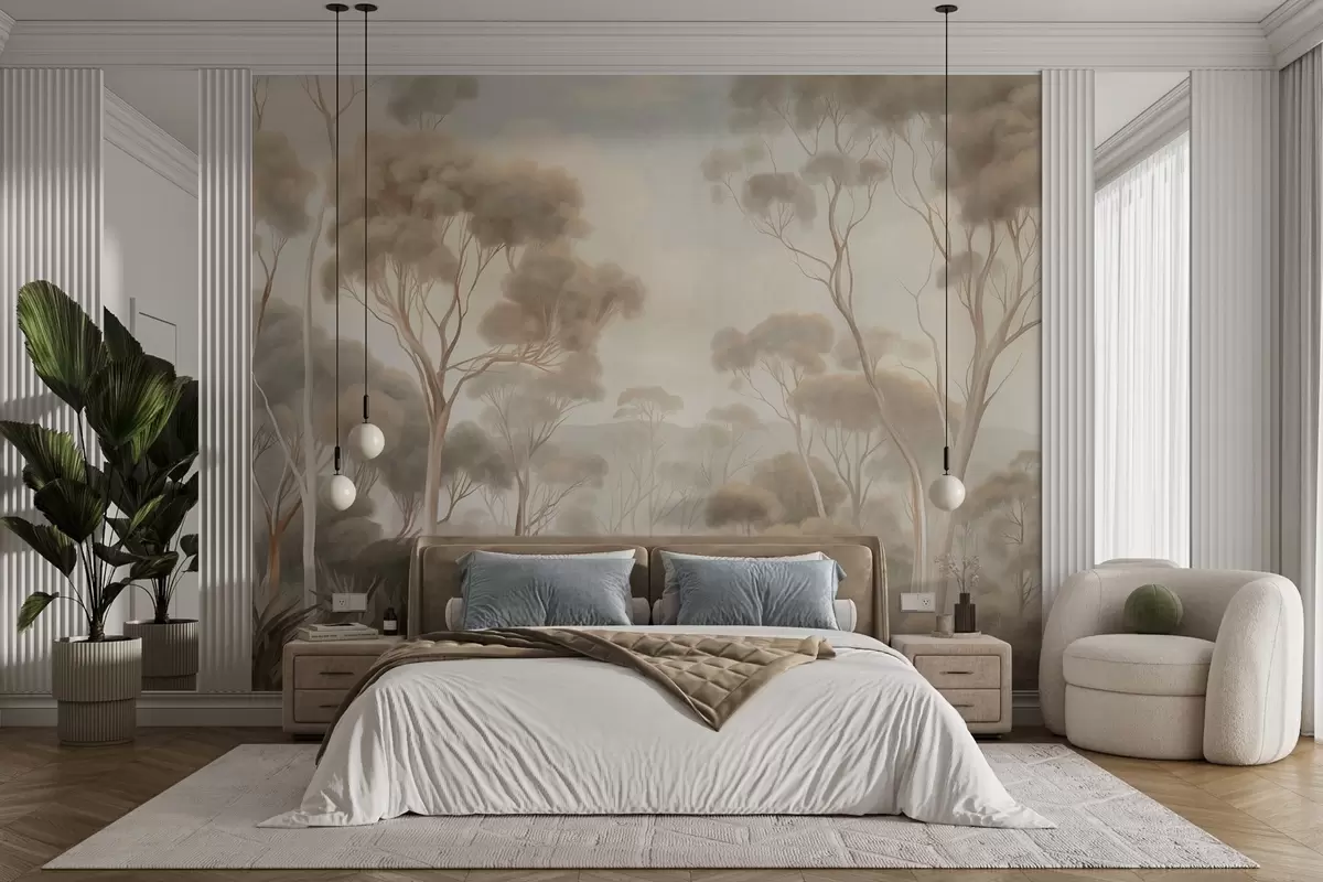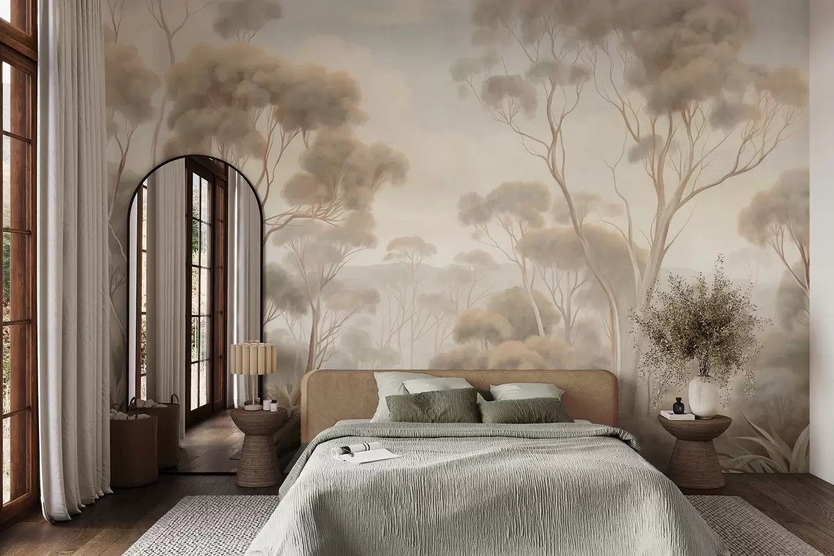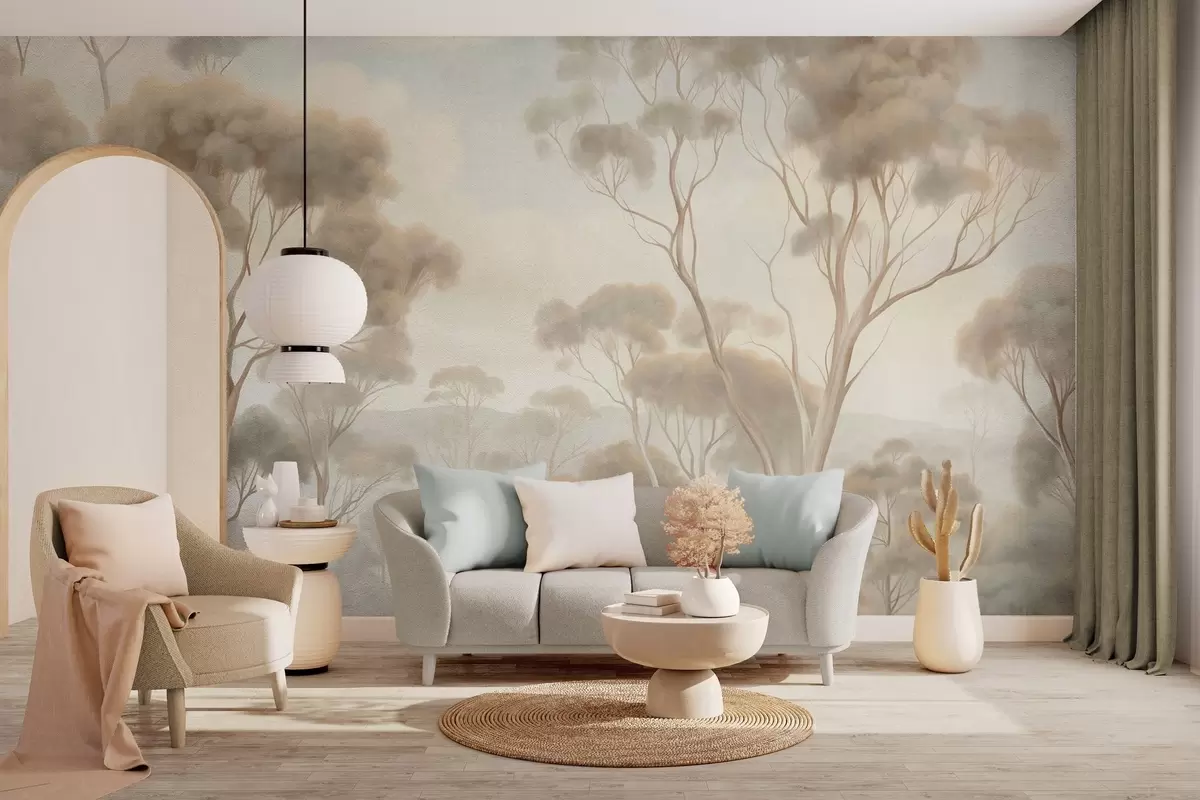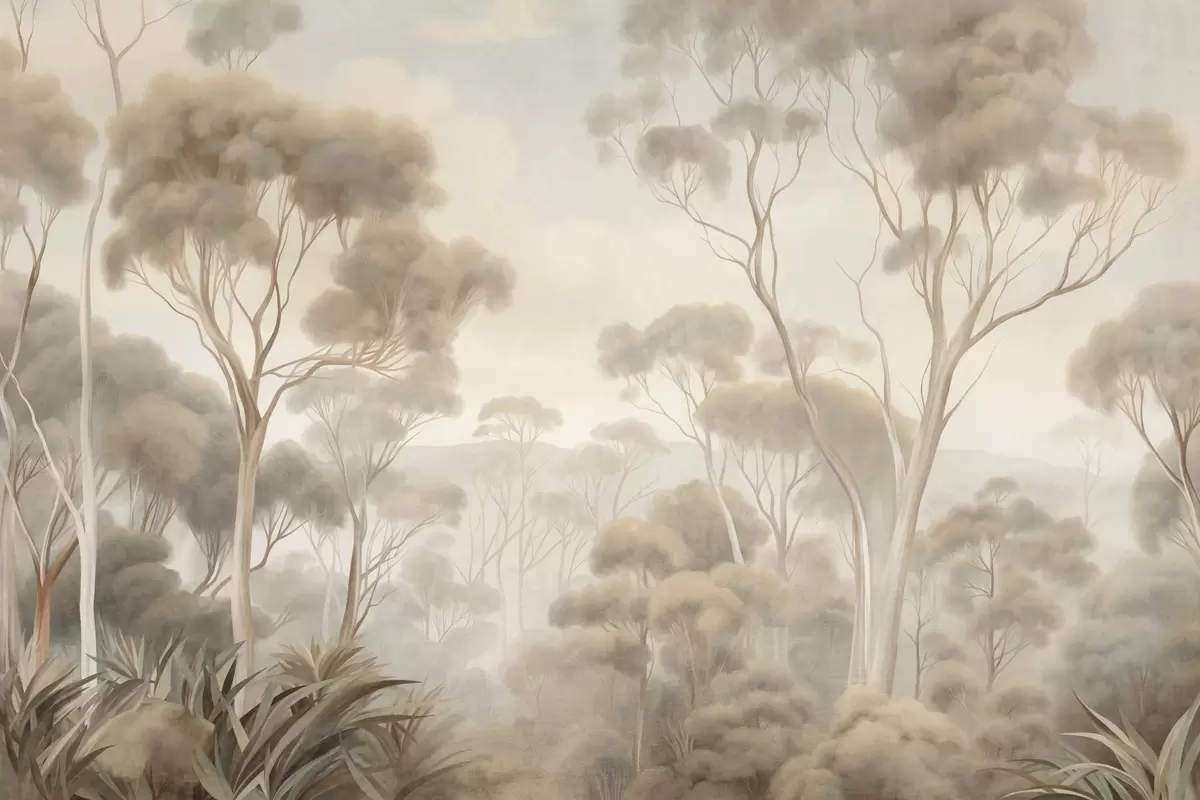 Wall murals A misty forest landscape with tall eucalyptus trees, with rolling hills under a cloudy sky, textured art Nr. w09822