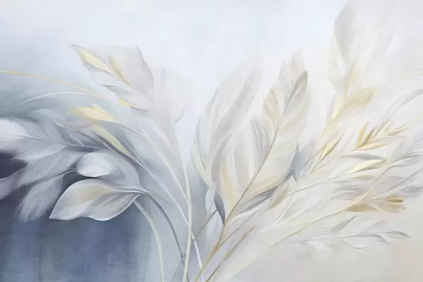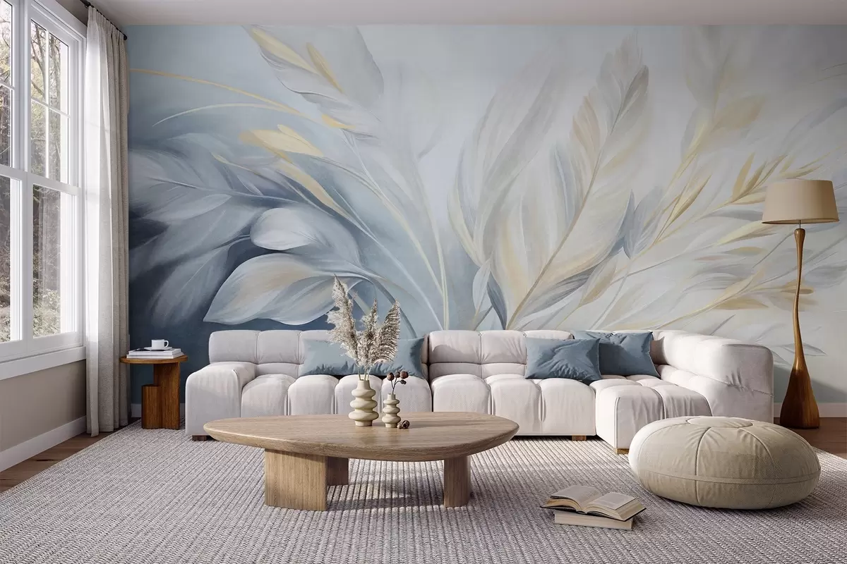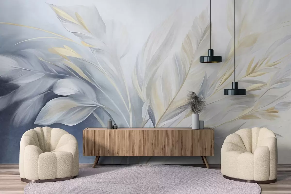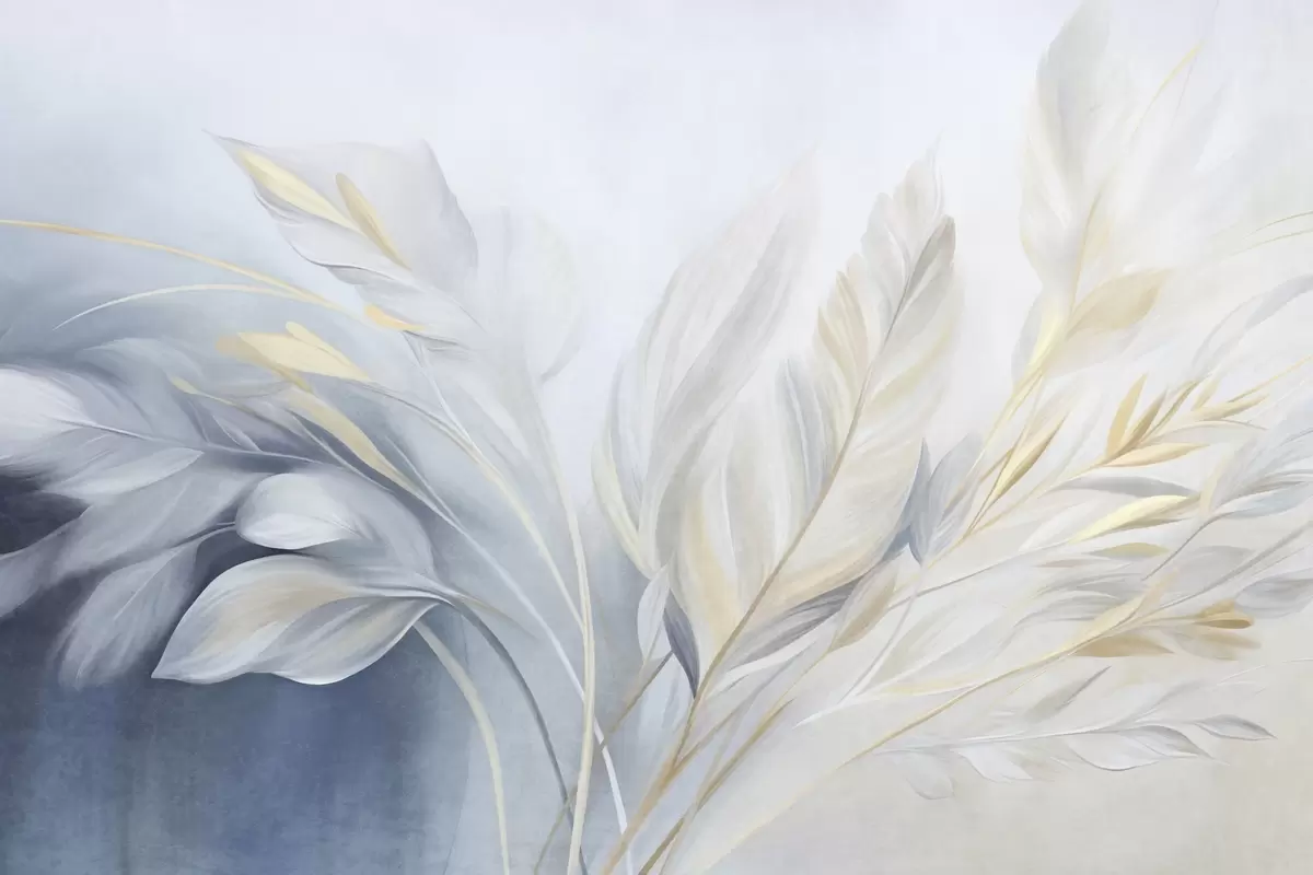 Wall murals Textured feathers with yellow accents, against a soft background of pale blue and white Nr. w09826