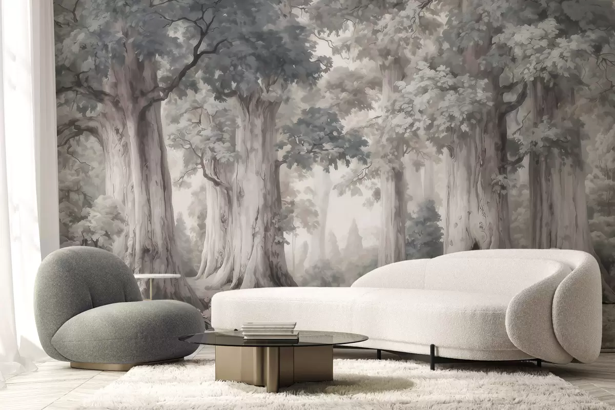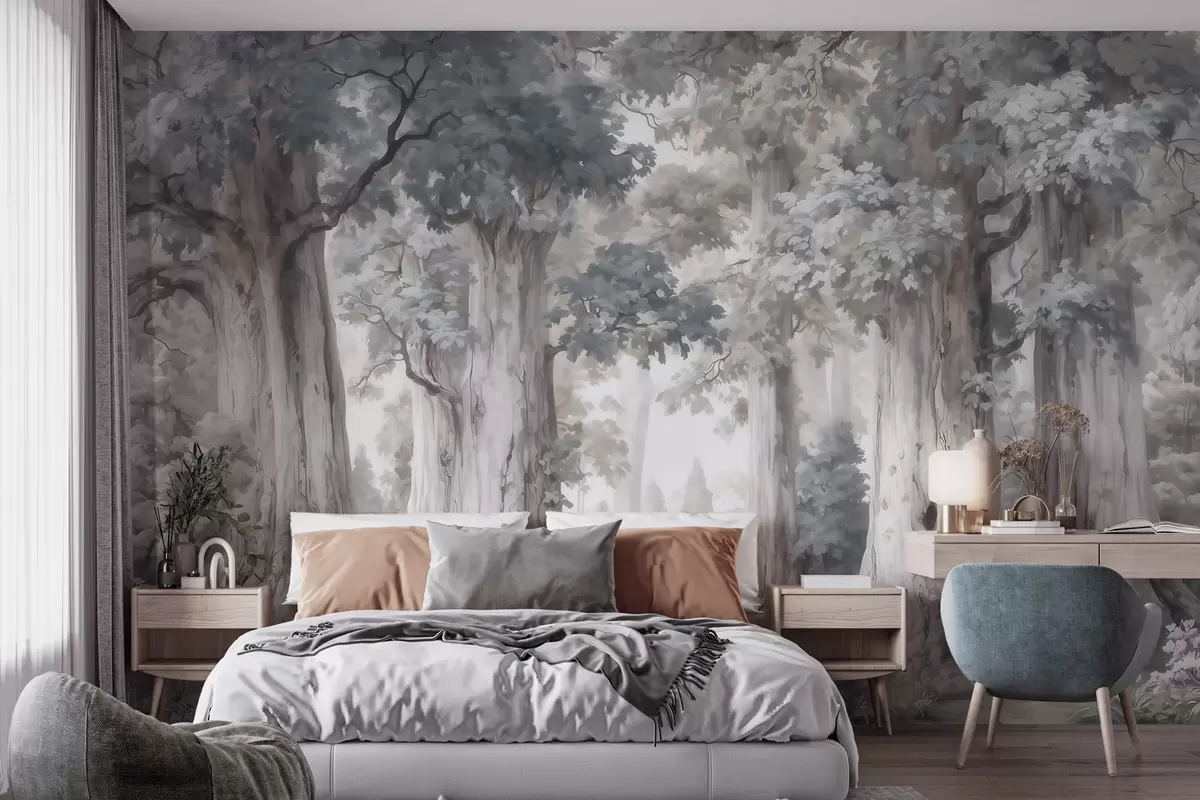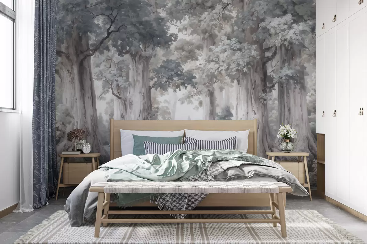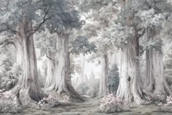 Wall murals A fairytale forest with tall trees and a gentle muted palette in watercolor style Nr. w09849