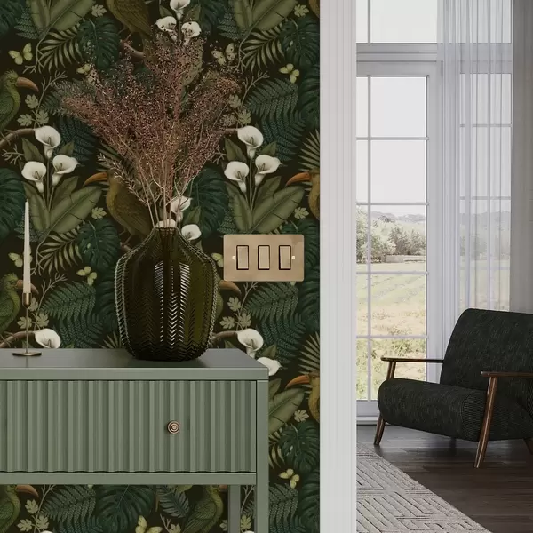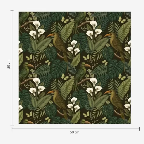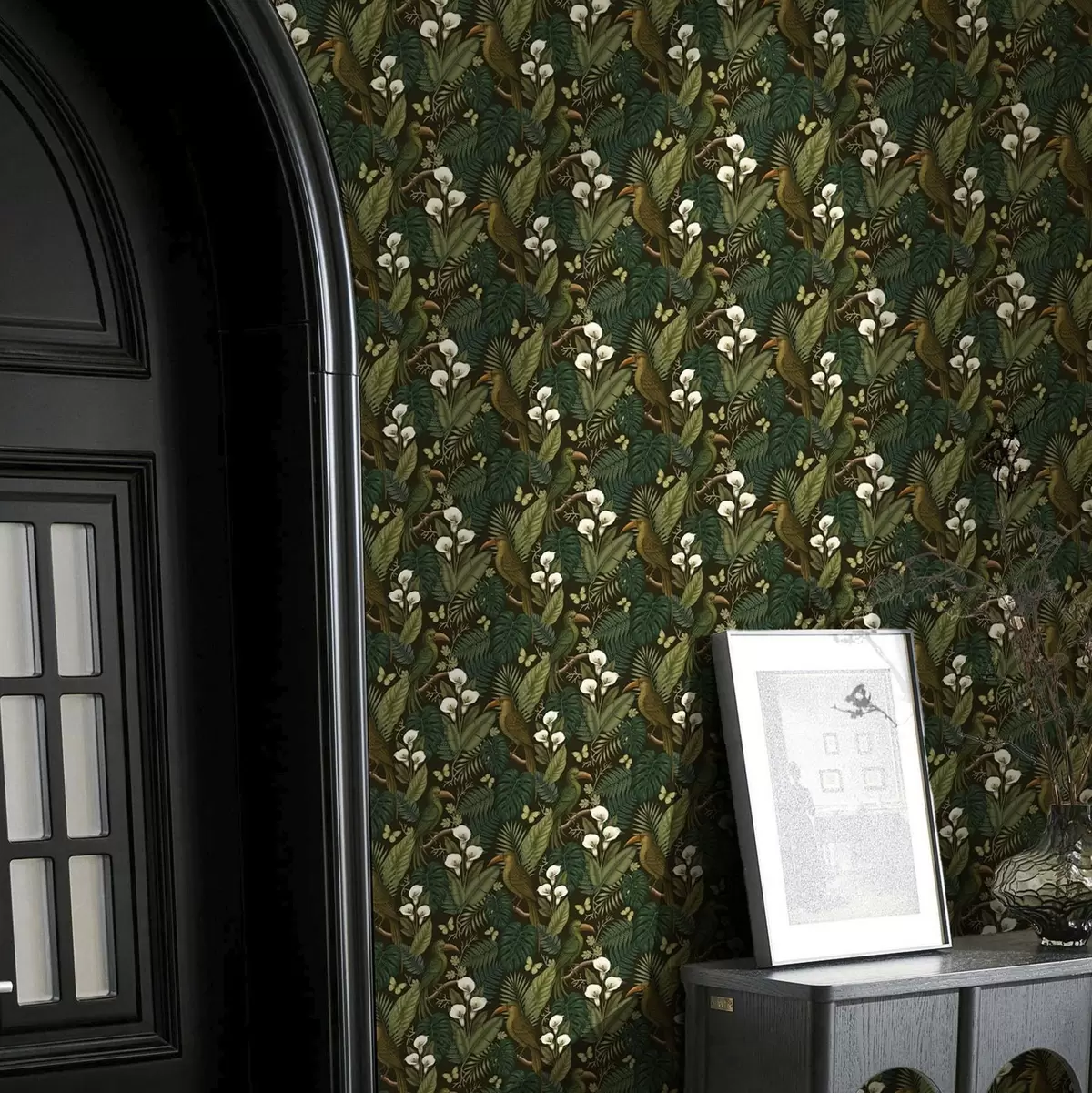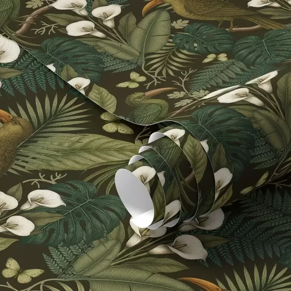 Wallpaper Tropical birds and lush greenery on dark jungle background a00397