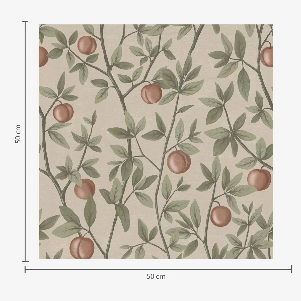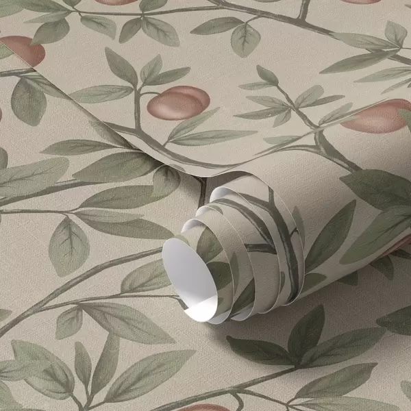 Wallpapers Peaches on branches with green leaves on beige background Nr. a00429