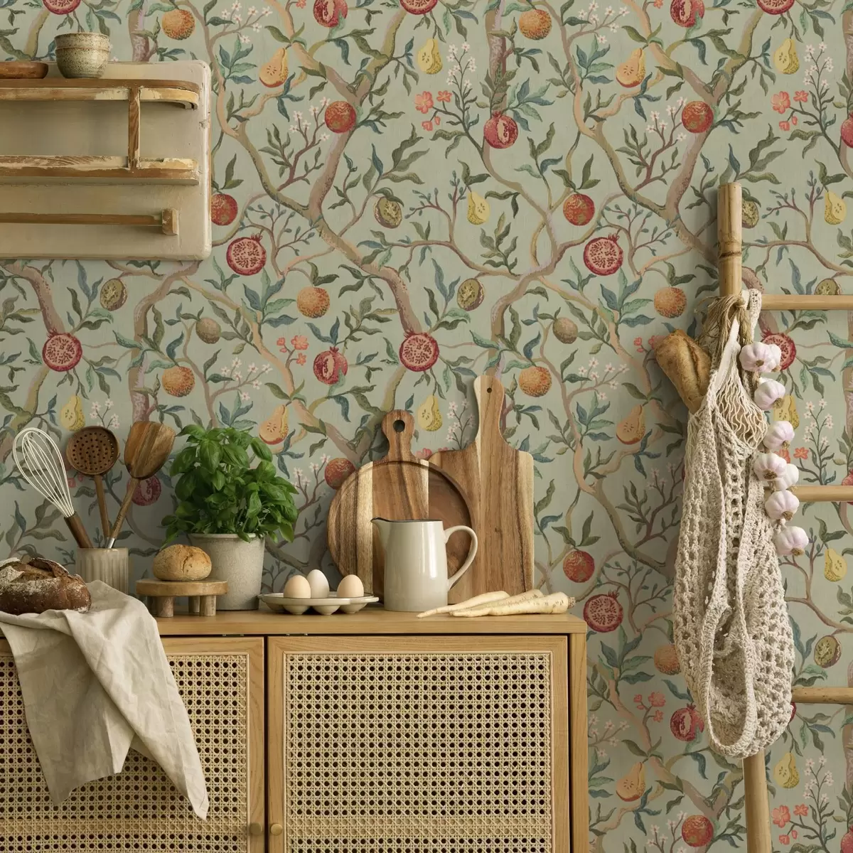 Wallpapers Pomegranate fruits, pears and flowers on a pale green background Nr. a00465