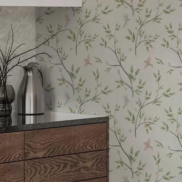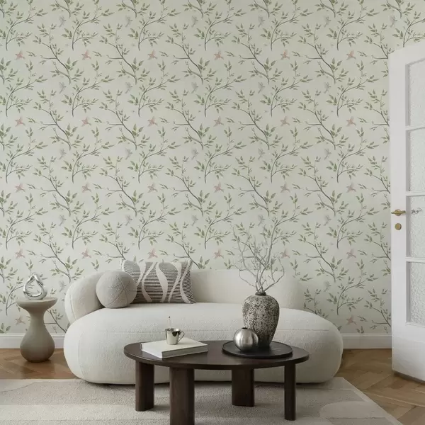 Wallpaper Watercolor branches with leaves and birds on a light ground a00496